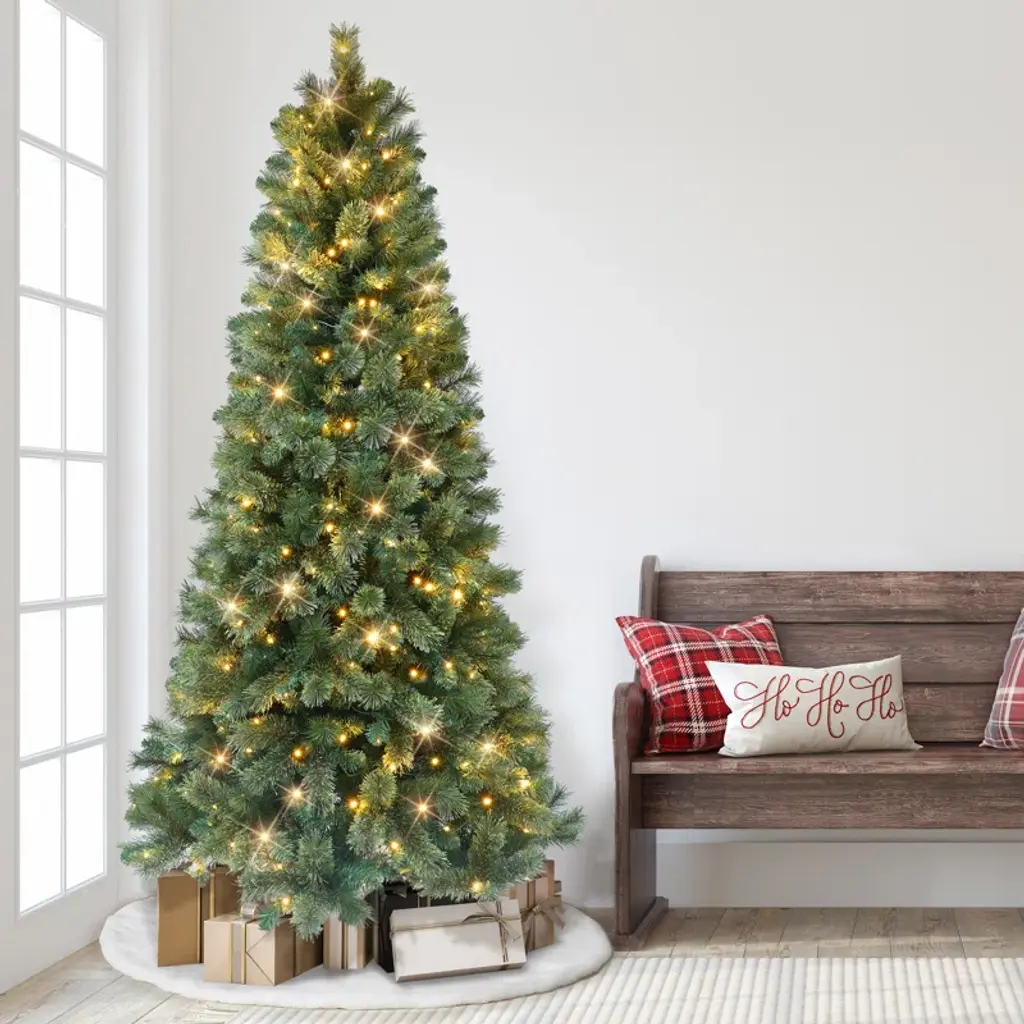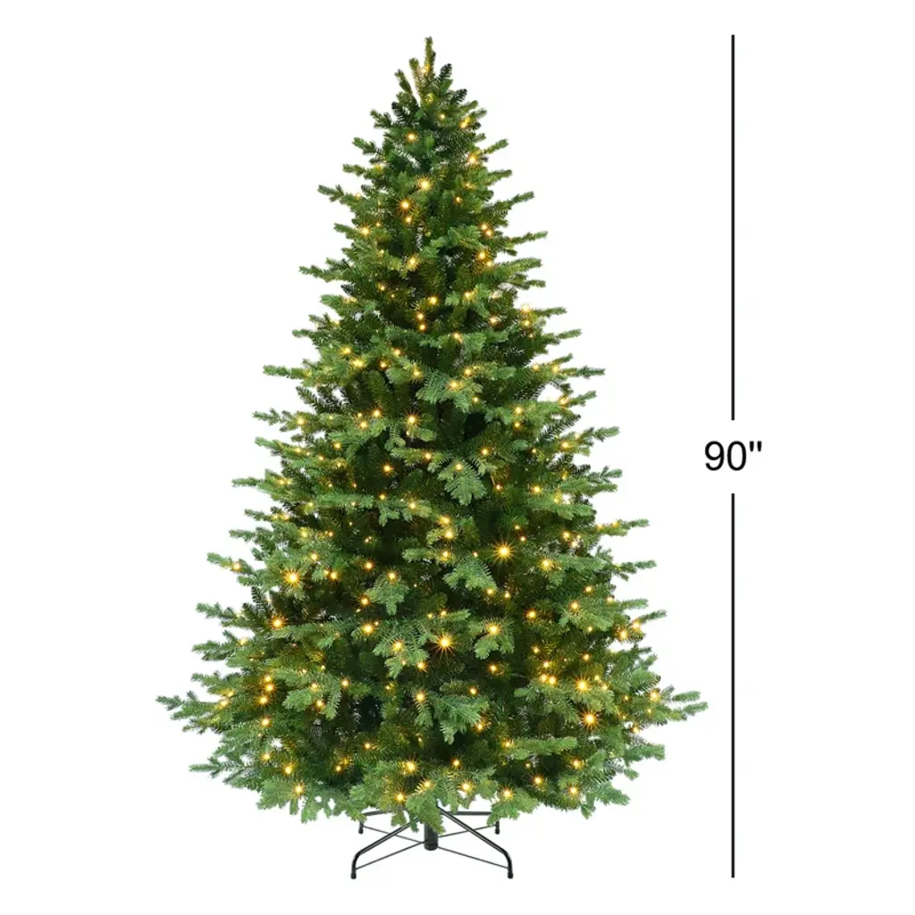 Bring the holiday cheer. This full, artificial Christmas tree comes pre-lit with 550 multicolored lights for an enchanting display. With a sturdy metal stand and durable construction, it's built to last for many festive seasons to come.