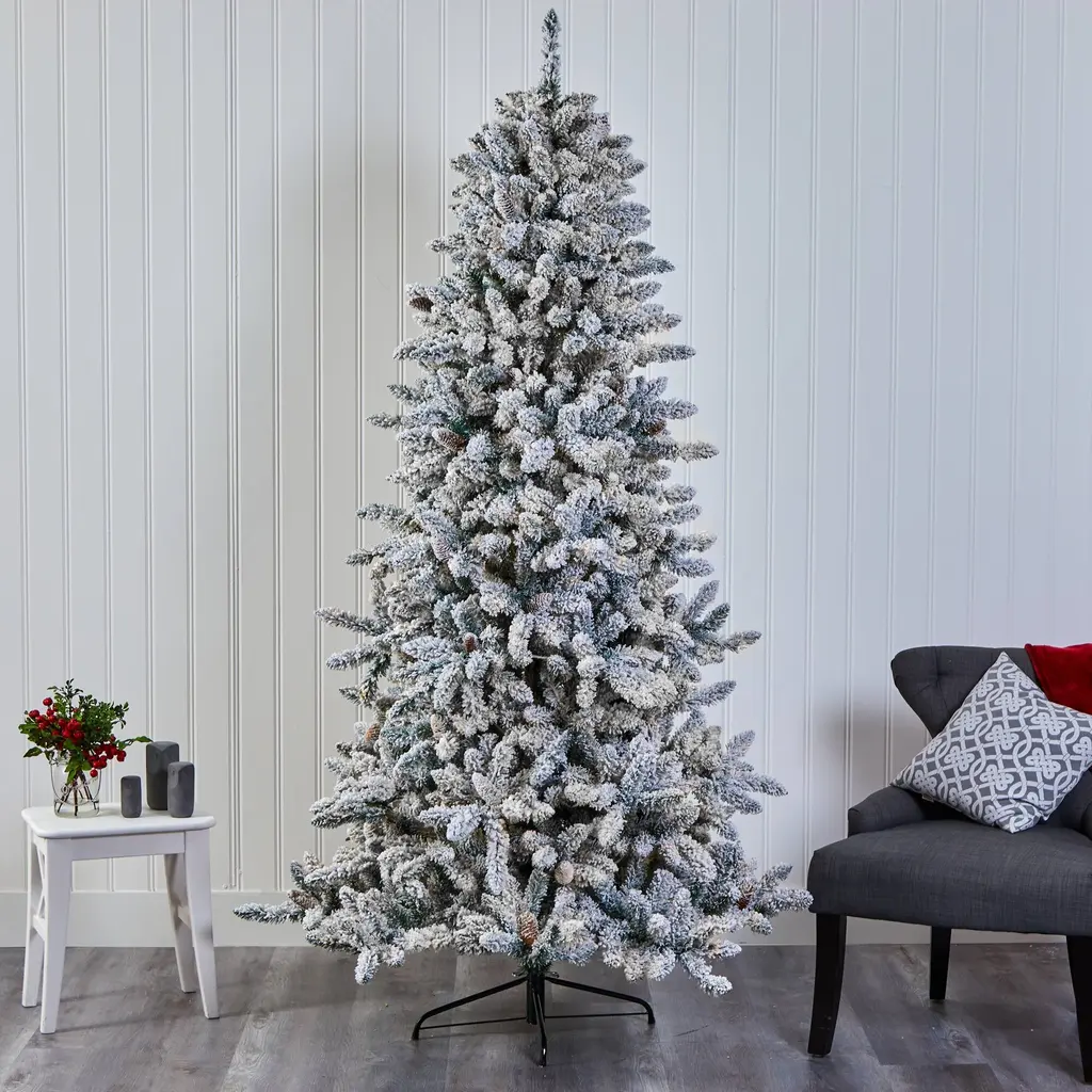 Create a true Christmas scene in your home or office with the help of this flocked artificial Christmas tree! Completely maintenance-free, this winter-inspired fake Christmas tree boasts an array of soft looking foliage (1336 tips to accent with your holiday ornaments!), all beautifully flocked in soft evergreens and handsomely accented throughout with faux pinecones, stabilized on a metal stand, this impressive 7.5' tall Christmas tree will not only make holiday decorating a breeze but ensure your home is always looking picture-perfect throughout the holiday season.