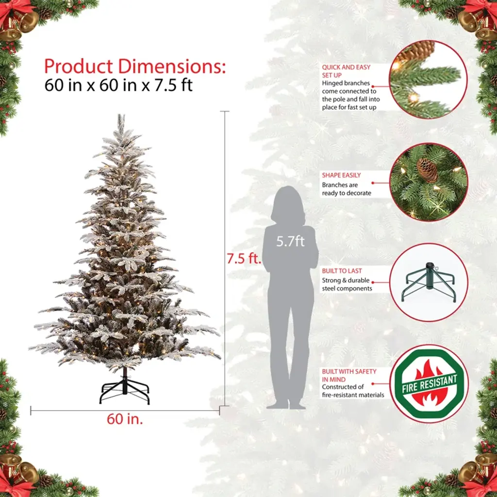 This artificial Christmas tree delivers all of the magic with none of the maintenance. It's made from polyethylene in a green hue, and it features frosted branches that mimic the foliage of an Aspen fir tree. This faux evergreen comes with a metal tree stand, and it's pre-strung with 700 clear incandescent bulbs for a warm Christmas glow. Primp and fluff its snow-dusted branches when it arrives, and decorate it with the holiday ornaments of your choice (sold separately). This tree measures 7' 6" high and 5' wide.