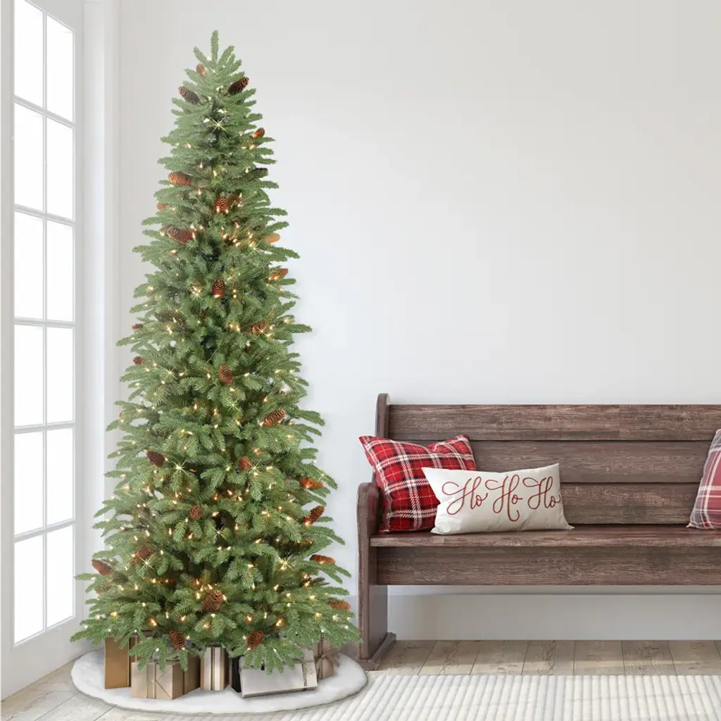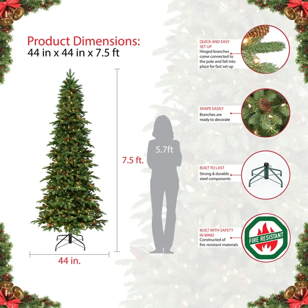 Deck the halls with The Holiday Aisle 7.5-foot Pre-Lit Slim Montville Spruce Artificial Christmas Tree. Inspired by lush wintry forests, this artificial tree has 871 branch tips (505 PE and 366 PVC), Glitter Accents, and 450 Incandescent Clear Lights. The incorporated lights mean no more climbing ladders to string lights, saving decorating time. When a single bulb burns out, the other lights on the strand will stay lit for your convenience. We recommend changing the burnt bulb to prevent future outages. Hypoallergenic and needle-shed resistant, the tree is a great alternative to a yearly real tree purchase. With easy-to-assemble pieces and an included base, your house will be ready for the holidays faster than you can say "Rockin' Around the Christmas Tree".
