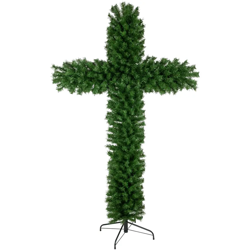 This pine cross Christmas tree is definitely one of the most magnificent trees to enhance your home or yard. It's powerful size helps us to remember the reason for the season. Whether in your home or on a covered porch this showstopper will definitely command attention. Product Features: Unlit. 700 tips. 1.75" wide tapered tips. Flame retardant. For indoor use only. 6-piece easy assembly (including stand). Comes with a FREE green metal tree stand. Recommended for indoor use or outdoor under a covered area. Dimensions: 84"H x 52"W x 14"D. Material(s): PVC/metal/wire. Note: Cross must be fluffed and shaped for desired fullness. Note: Branches are compressed for shipment and need to be fluffed out upon arrival to look like the photo.