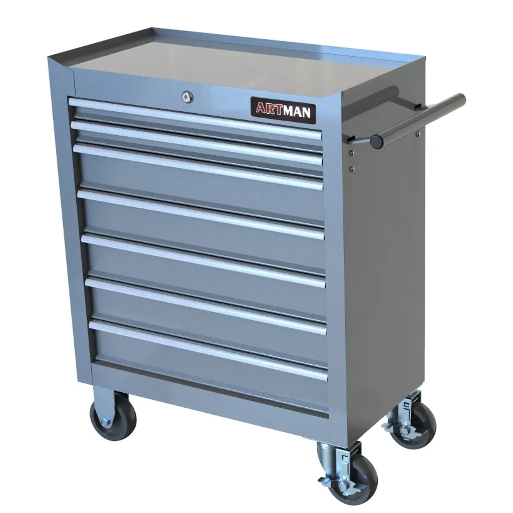 The tool trolley is equipped with a total of 7 drawers.The tool box is also lockable and can be used as a removable, attachable and mobile case attachment.The opening and closing of the drawers of the tool cabinet is very gentle thanks to the ball-bearing drawers.The robust and powder-coated steel construction is used for high wear resistance. This assembly trolley has 4 steering wheels, 2 of which with parking brakes, so you can move the trolley freely in the garage, but also stop in one place.