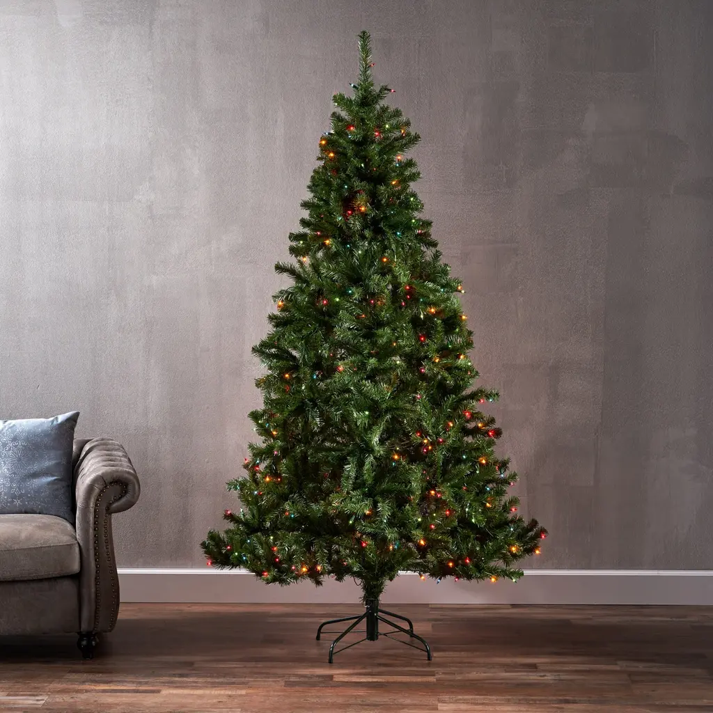 7-Foot Pre-Lit Noble Hinged Christmas Tree With 500 Multilights-Ul, 48" Wide, Sturdy Iron Stand, & Assembly Guide - Green