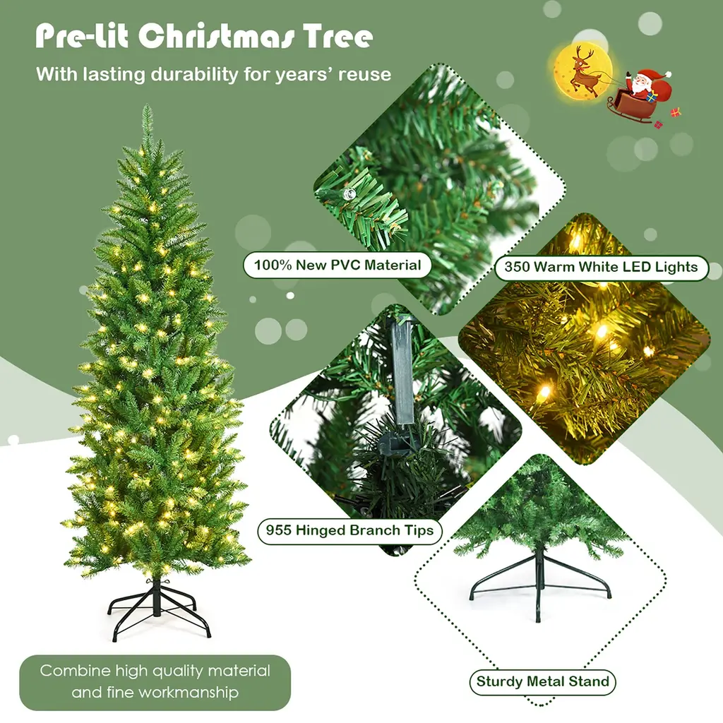 Description Are you considering a moderately sized Christmas tree? Our Christmas tree is made of high-quality PVC material, which can make our tree more realistic and strengthen the metal base design will make it more sturdy. It also features 350 warm white LED lights that emit bright lights to brighten up any corner you place it. With it, you can make your family dinners and parties full of a festive atmosphere and make your family happier. Features