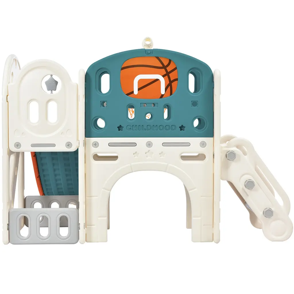 Certified Material - Quality is always our top priority when making toys for kids. Made of certified high-quality HDPE material, this kids' slide is completely non-toxic. This toy slide set can be safely accompanied by kids for a long time.7 IN 1 Slide Set - This slide playset structure includes 7 main play parts which are kids' favorites: a step ladder to climb, a smooth slide to rush down freely, a basketball hoop and a toss ring to play, an arch tunnel for crawling, a toy telescope, and an organizer compartment to hide and store their own small toys.Novel Modeling Design - Give your kids a brand-new and refreshing gift! This star-themed slide climber playset has an impressive shape. Build a little world for your child to explore indoors. Helping them develop an abundance of curiosity about the world.Thoughtful Details - As a set of kids' play structures, the steps and slides are made of sufficiently generous and sturdy structures. Meanwhile, we also attached a small surprise basketball hoop ring for your kids, so that they can fully release their vitality.Easy Setup - This set of slide climber playhouses will take up about 60.2x73.2 inches of space, but it's totally worth it. After some simple assembly, your kids will have a fantastic little playground in your house. Slide length: 78.7inches