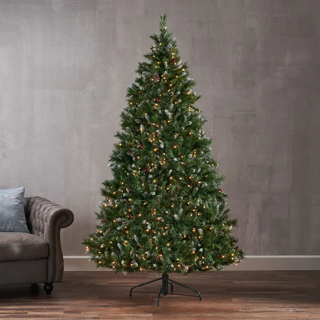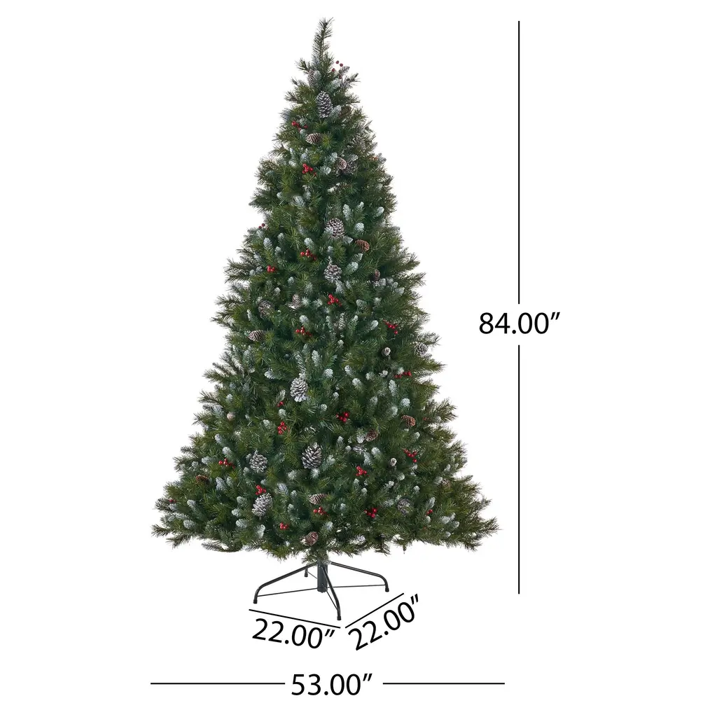 7' Mixed Frosted Hinged Tree with 52 Frosted Pine Cones and 26 Red Berry and 450 Clear Lights-UL,Dia:53",1219 Tips.Features:Specification: