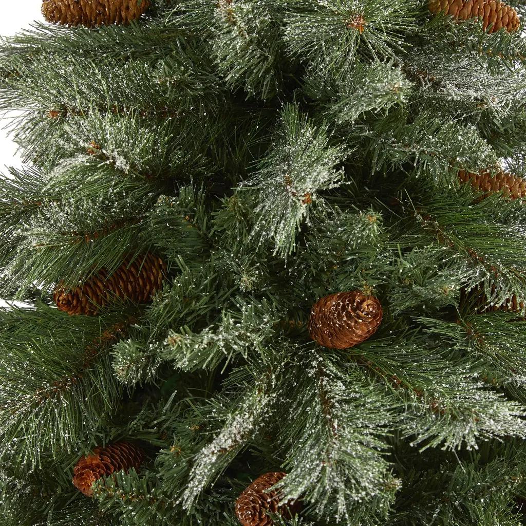 Evoke hints of a winter wonderland this holiday season with the help of this snowy artificial Christmas tree! Completely maintenance-free, this winter-inspired fake Christmas tree boasts a robust silhouette of snow-dusted foliage made up of 833 easy-to-bend branch tips for decorating with your own holiday ornaments, accented throughout with faux pinecones that look incredibly lifelike. Carefully stabilized on a metal stand, this enchanting 7' tall snowy artificial Christmas tree will not only make holiday decorating a breeze but ensure your home is always holiday-dressed for years to come.
