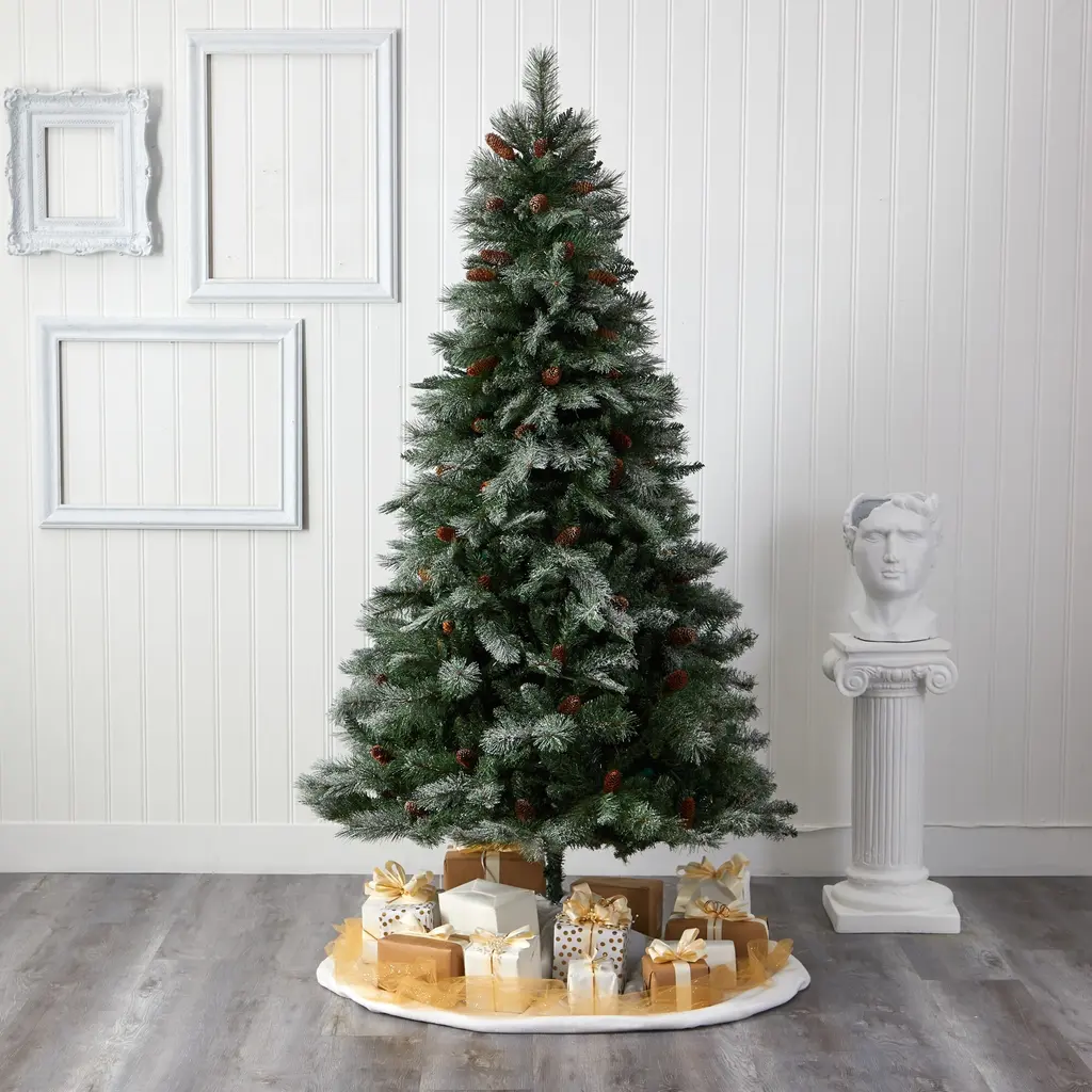 Bring the beauty of winter into your home with this stunning snowed french pine artificial Christmas tree. Featuring snow dusted foliage and 833 bendable branches, this tree provides a sturdy foundation for all your favorite holiday ornaments. Accented with faux pinecones that look incredibly lifelike, this tree is the perfect addition to your holiday decor. Stabilized on a stand, this maintenance free tree will ensure your home is holiday dressed for years to come. Product Features: Unlit Faux snow for a winter setting Accented with faux pinecones for a natural appearance 2-piece easy assembly (including stand) Comes with a FREE black metal tree stand Assembled in the USA Care instructions: wipe clean with a soft dry cloth Dimensions: 7’ high (from the base of the stand to the top of the tree) 46” base diameter (at the widest point) Material(s): polyvinyl chloride Note:Item will need to be reshaped when removed from the box