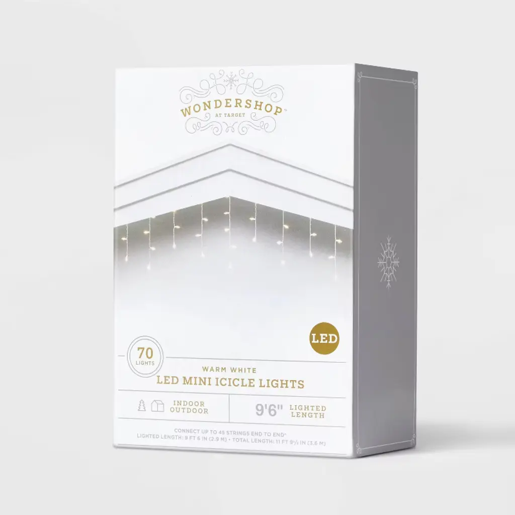 Create a bright and festive backdrop for your party or everyday holiday decor with the 70-Count LED Christmas Icicle Lights with White Wire from Wondershop™. The set includes 70 lights that hang down from the main wire to mimic the look of icicles. The lights are white and LED, also suitable for indoor and outdoor use. Add these lights to windows or walls, or hang in the porch to illuminate your home with holiday cheer.Wondershop™: Welcome to the Wondershop.