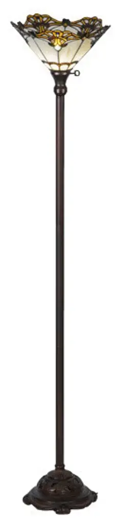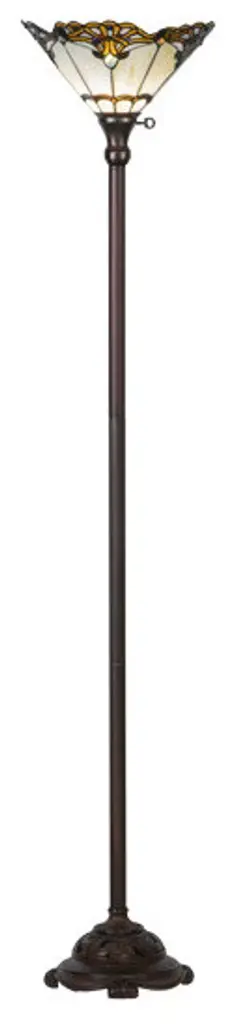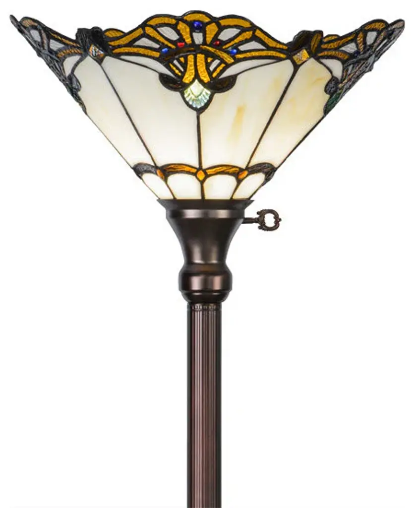 Oceanic Iridescent Blue/Green Jeweled nautical shells, surrounded by Blue and Red jewels, highlight an intricate Art Nouveau motif in Amber and Clear Ripple glass, accented with iridescent Amber formed jewels on Bone Beige. A Multicolored ringlet motif featured on bottom accented with Amber oval jewels while Amber diamond shaped jewels accent the top. The shade was handcrafted using Meyda Tiffany''s famous copper foil construction process and complemented with a floor base finished in Mahogany Bronze. UL Approved: YesBulb Type: MEDBulb Quantity: 1Bulb Wattage: 100Bulbs Included: No