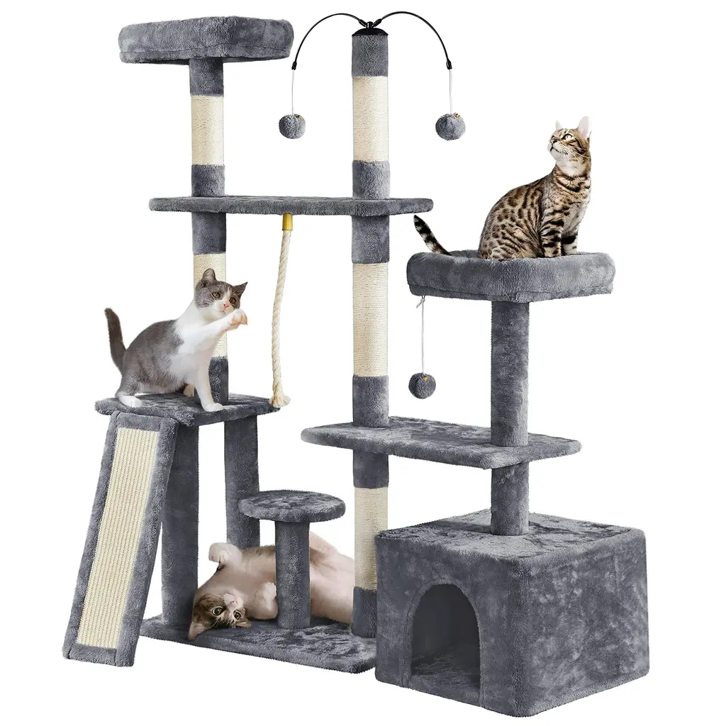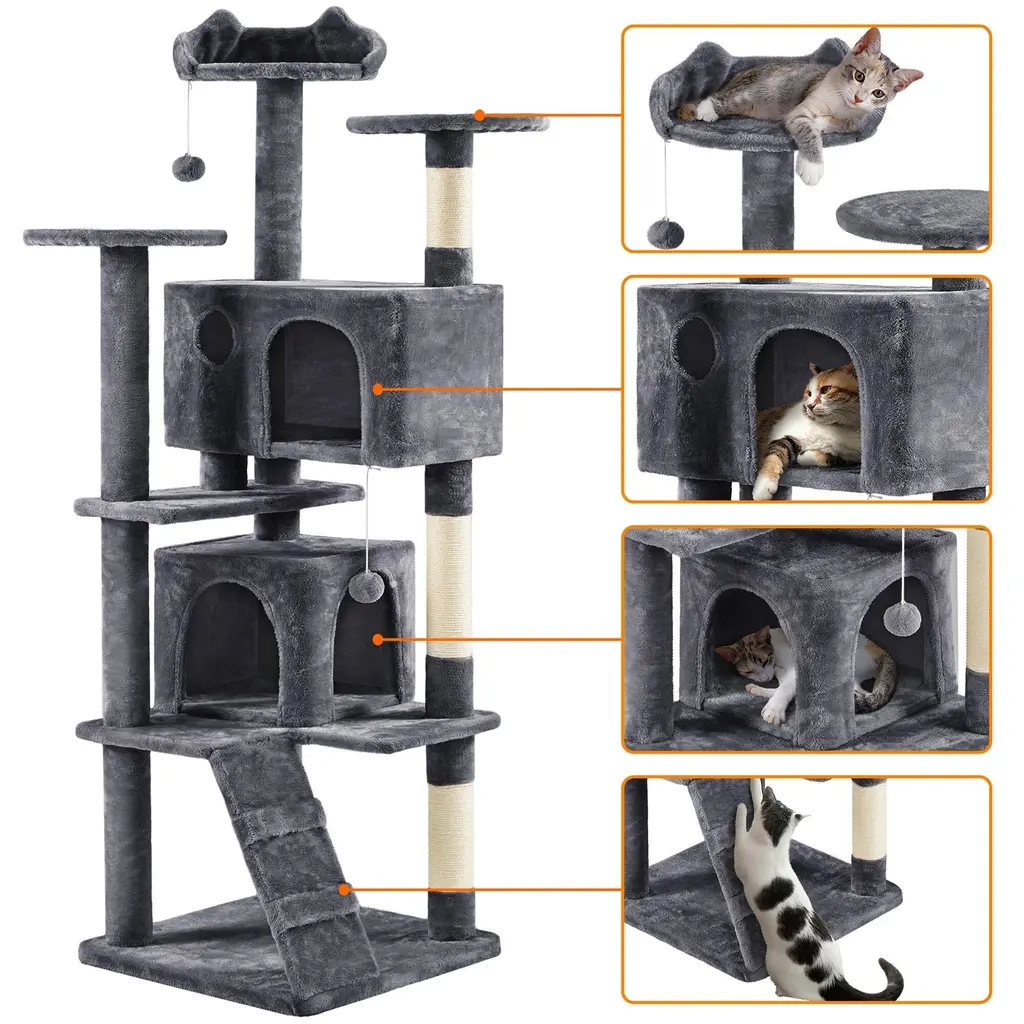PET-FRIENDLY MATERIALS: Constructed of solid particleboard and plush and sisal ropes, this free-standing cat tree is pet-friendly and durable for a long time, with no hazardous substances to your cats and families MULTILEVEL DESIGN: Featuring multiple levels, this cat tree perfectly meets cats' needs for playing, lounging, sleeping, and exercising. A top cat-ear-shaped perch and two round platforms are good spots for viewing. Two cat condos are absolute personal spaces, suitable for sleep MUST-HAVE FOR FAMILY WITH CATS: This kitten tree provides a vertical territory for your cats to climb, play, scratch, establish authority or hide. It is steady for cats to jump on and off, and cozy for them to perch and nap CAT SCRATCHING POSTS: Three sisal scratching posts in different heights satisfy several cats and their various scratching habits. More importantly, free your fine furniture from those sharp little claws DANGLING BALL: The cat condo and the top perch hang a ball for more excitement, and you can remove it or replace it with your own balls