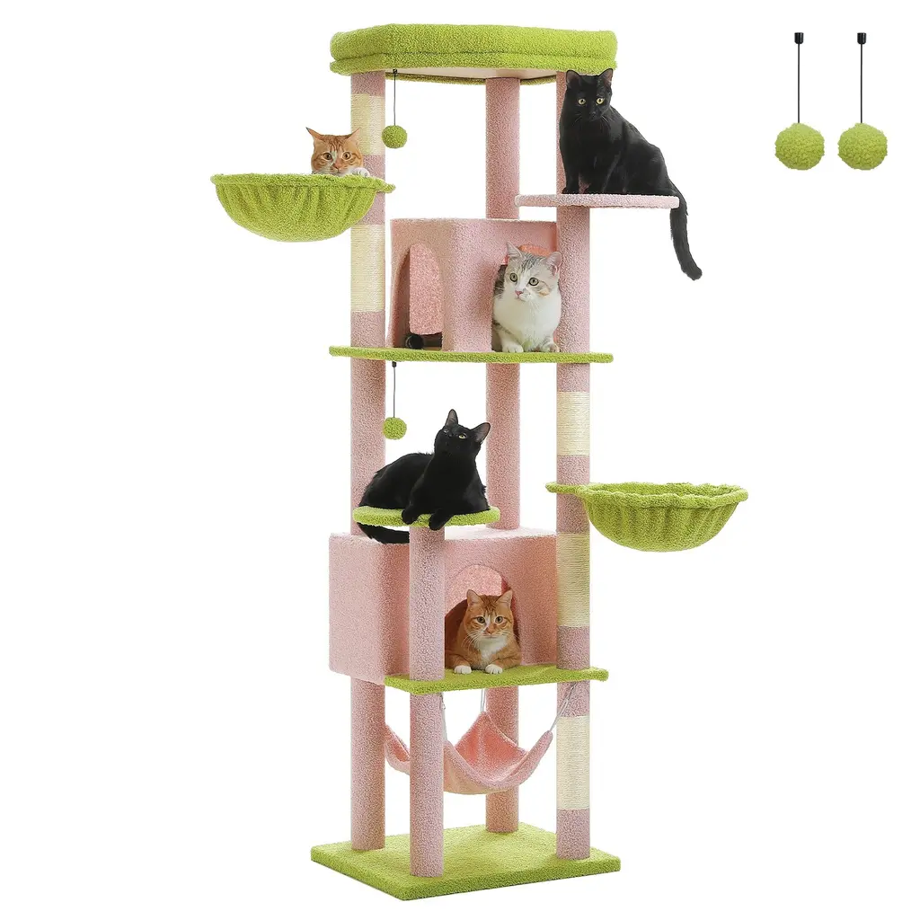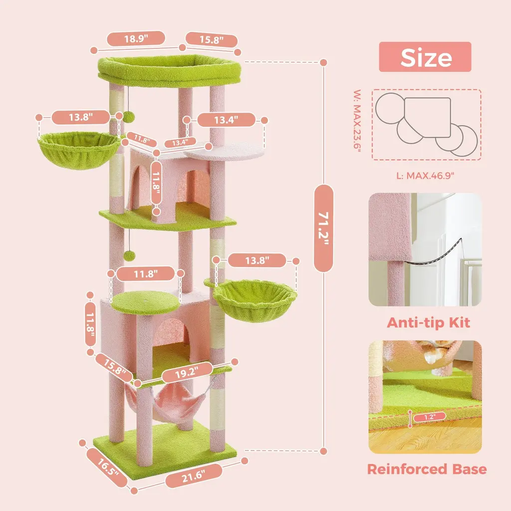 Transform your living space into a cat haven with this Large Cat Tree - a 4-level cat tower that combines functionality, comfort, and style. Designed with your feline's needs in mind, this cat tree offers multiple levels for climbing, playing, and resting. It includes one large cushioned perch and two spacious hammocks, ensuring your cats have plenty of comfy spots to relax. Multi-Level Design for Maximum Play & Rest: Comfortable Resting Areas: Scratching Paradise with 5 Scratch Posts: Cozy Apartments for Privacy: Sturdy & Durable Construction: