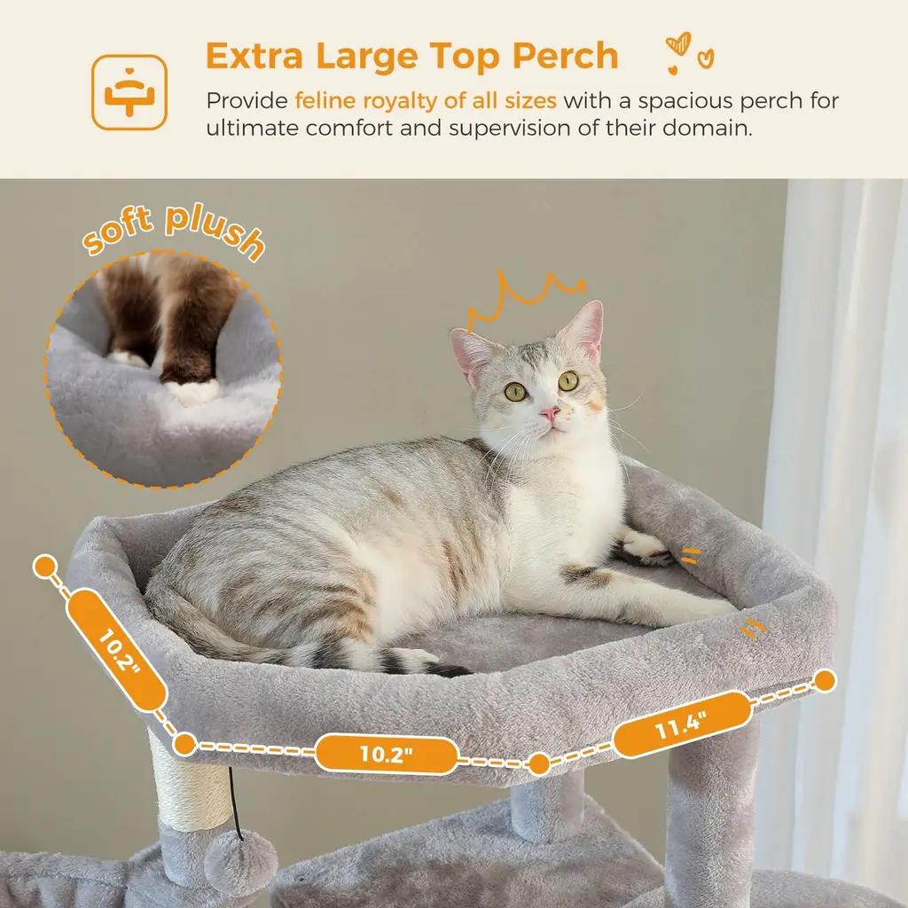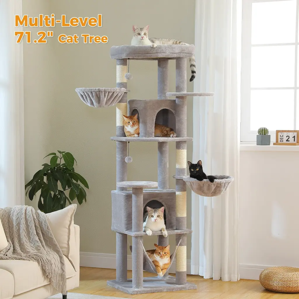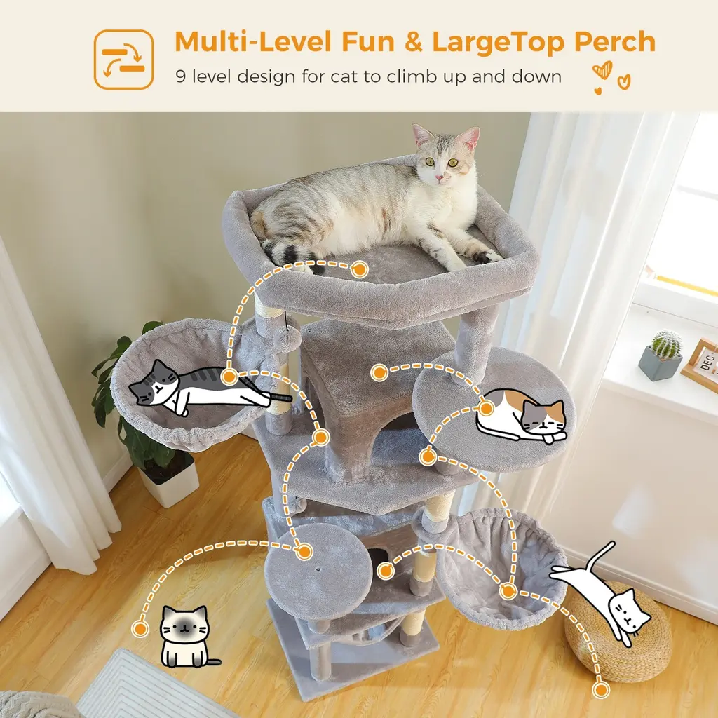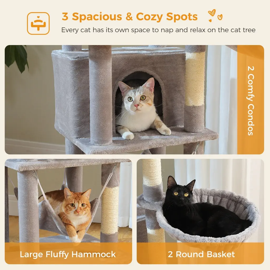 Transform your living space into a cat haven with this Large Cat Tree - a 4-level cat tower that combines functionality, comfort, and style. Designed with your feline's needs in mind, this cat tree offers multiple levels for climbing, playing, and resting. It includes one large cushioned perch and two spacious hammocks, ensuring your cats have plenty of comfy spots to relax. Multi-Level Design for Maximum Play & Rest: Comfortable Resting Areas: Scratching Paradise with 5 Scratch Posts: Cozy Apartments for Privacy: Sturdy & Durable Construction: