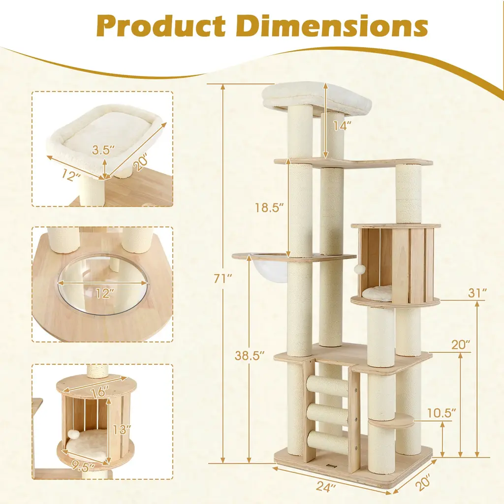 Specifications:Description:This 71" tall wooden cat tree offers a sturdy and stable construction with thickened 4.6" supporting posts and a reinforced 1.5" base, ensuring a wobble-free foundation for your cats to jump and lounge. Featuring multiple resting spots at different heights, it includes a cozy top perch, a spacious cat condo for private naps, and a transparent space capsule for curling up. Equipped with scratching posts and a 3-step ladder wrapped in ropes, it helps sharpen claws and protect your furniture. The plush dangling ball adds fun, while removable, washable cushions ensure comfort and hygiene. Its natural wood color complements your home decor, offering a stylish and functional addition to any room.Key Features:● Sturdy and Stable Construction: Constructed with 4.6" thickened supporting posts and a 1.5" reinforced base, while crafted from a solid plywood frame, this 71" tall wooden cat tree ensures a stable and reliable foundation for cats to leap and lounge without any wobble.● Multiple Resting Spots: This extra-large cat tower comes with a variety of resting spots at different heights for cats to explore. There is a cozy top perch for lounging and overlooking, a spacious cat condo for private napping, and a transparent space capsule for cats to curl up.● Add More Fun: This cat climbing stand is equipped with reliable scratching posts and a 3-step ladder wrapped with ropes, which could help cats sharpen their claws and protect your furniture from scratching. Additionally, it features a plush dangling ball to keep your cat entertained and mentally stimulated.● Removable and Washable Cushions: The perch and condo feature ultra-soft padded plush cushions, bringing warmth and ultimate comfort for cats to lie on. Moreover, the cushions are easily removable and machine washable, ensuring your pet's space remains hygienic and pleasant.● Attractive and Stylish Appearance: This wood cat tree comes with 6 layers for cats to climb up and down, offering multi-layer fun. With its natural wood color aesthetic, it could also seamlessly blend with your home decoration, adding a touch of style and elegance.