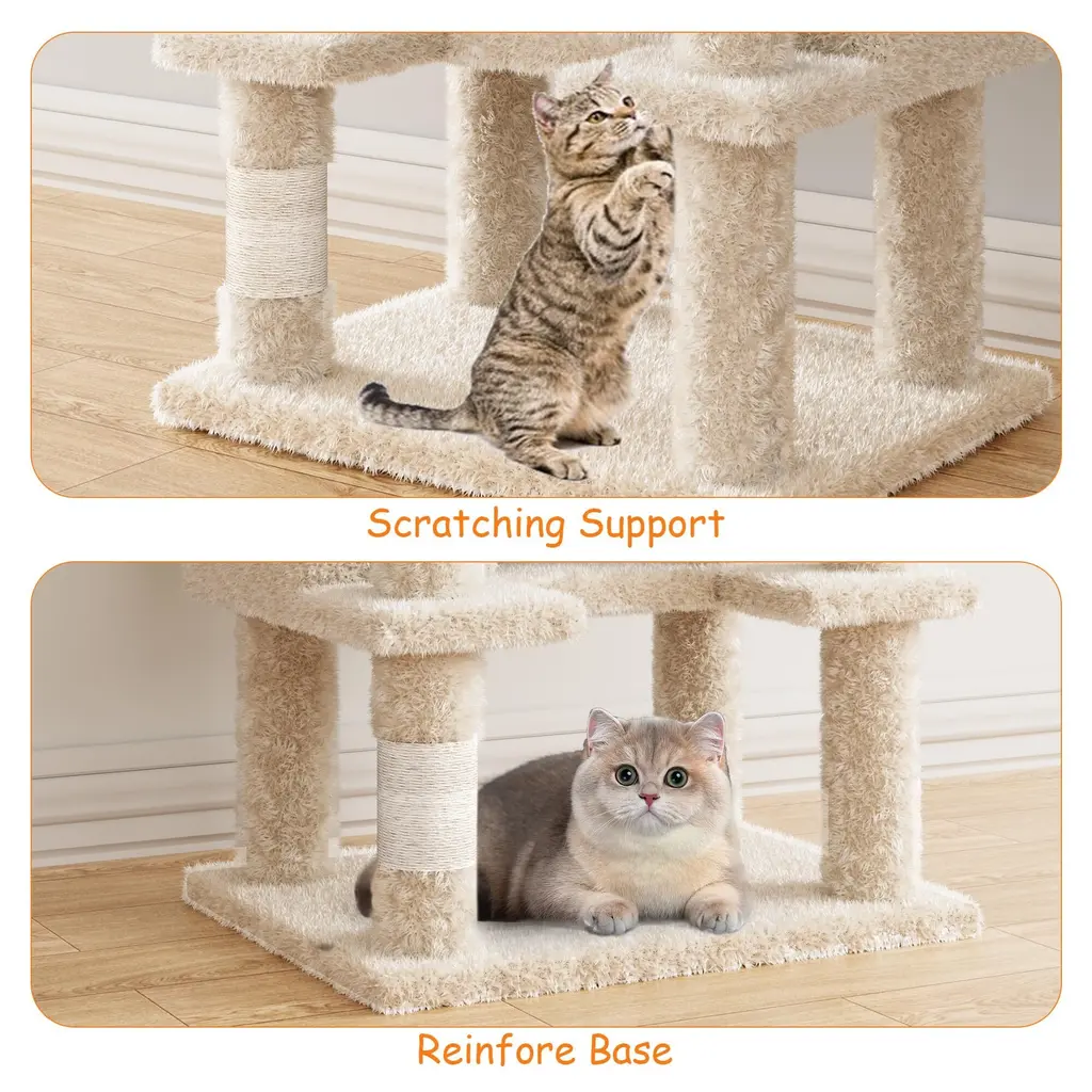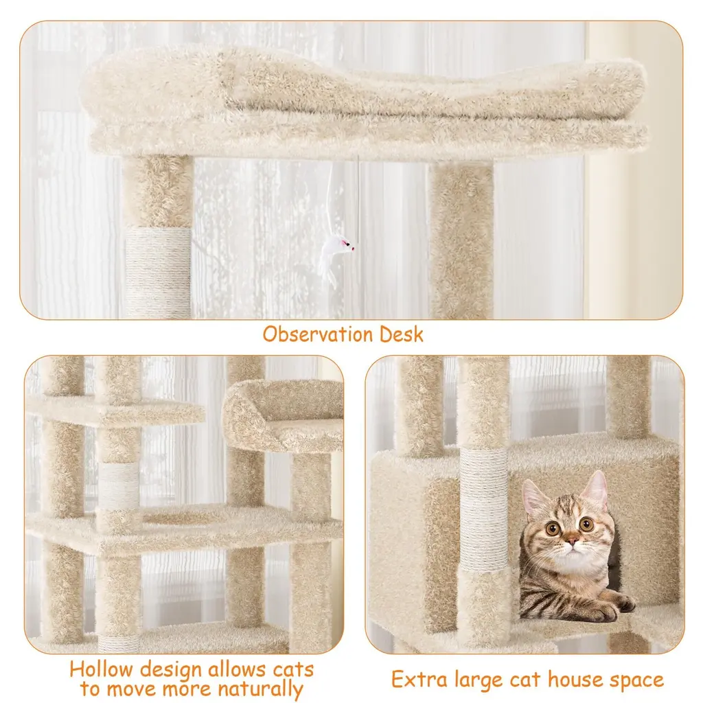 Tall Activity Center: Standing at 71 inches tall, this cat tree tower provides the ultimate all-in-one spot for your feline friend. It features elevated observation posts, scratchers, cozy napping spots, and multi-level exercise areas, catering to all the activities your cat enjoys and ensuring they stay entertained and active. Large Top Pedestal: The upgraded high-top resting area is designed to accommodate larger cats as well as kittens, providing a secure vantage point for your pet to overlook their surroundings. This spacious pedestal allows your cat to feel like royalty while enjoying a sense of safety and comfort. Protect Your Furniture: This cat tree meets your feline's natural climbing instincts while protecting your furniture from scratches. With two dedicated scratching posts, cats can indulge in their scratching behavior, and the included hanging toy encourages physical play, helping to stretch their muscles and enhance agility without damaging your home. Sturdy & Safe Design: Built with a wide and sturdy base, this cat tower includes an anti-tip kit for added stability. It's designed to ensure your active cat can jump in and out safely, providing peace of mind that the tower won't tip over, even during energetic play sessions. Easy to Assemble: The cat tree comes with detailed graphic instructions that make installation effortless. You can set it up in just a few minutes, and its design allows it to fit neatly into any room corner while adding a touch of elegance to your home décor.