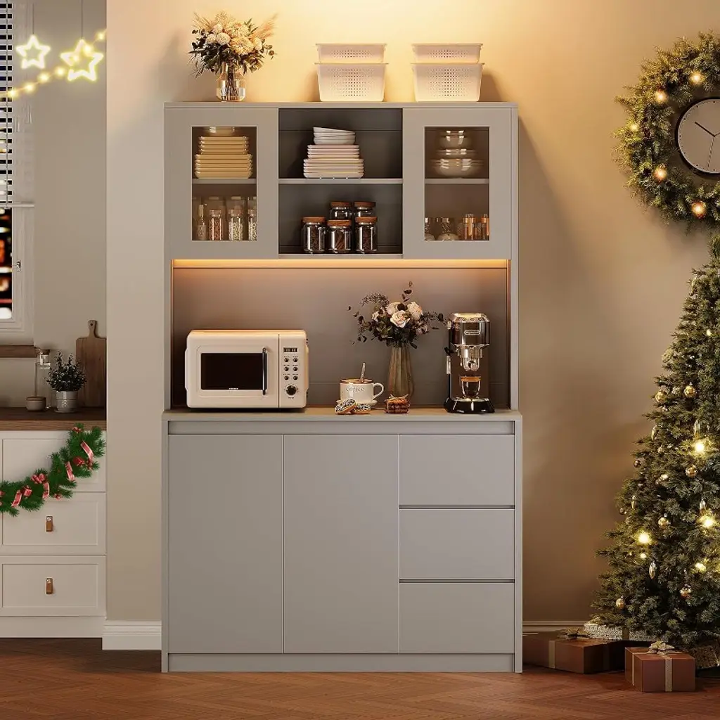 Maximize your kitchen storage with this 71" tall grey pantry cabinet featuring a sleek handleless design and versatile functionality. Equipped with built-in LED lights, two AC outlets, and two USB ports, this cabinet doubles as a convenient charging station for your kitchen appliances and devices. Its compact footprint makes it ideal for space-saving while providing ample storage with 4 adjustable shelves, 3 drawers, and spacious cabinets behind glass doors. The middle countertop is perfect for placing microwaves, toasters, or displaying decor. Made with durable engineered wood and designed for easy assembly with anti-tip safety components, this pantry cabinet is a stylish and practical addition for your kitchen, dining, or living area.