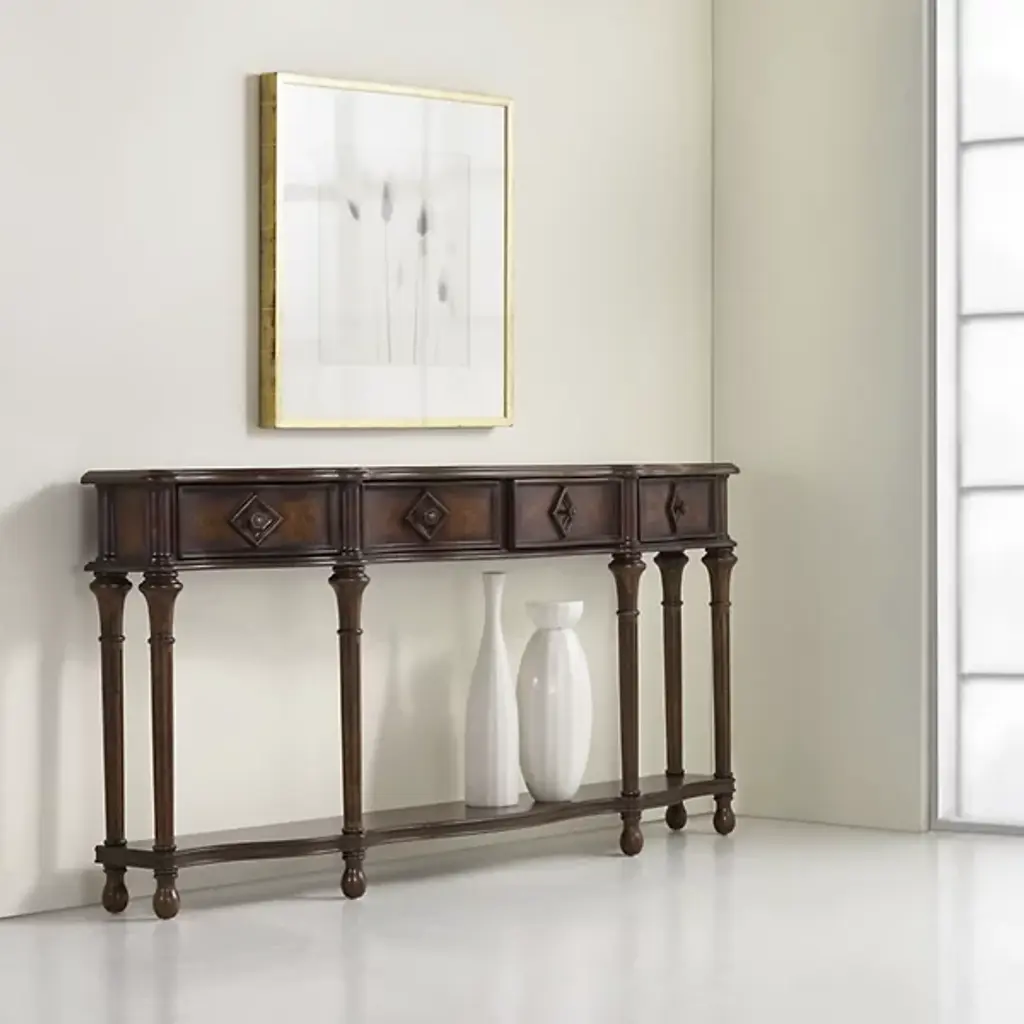 The 72 Inch Hall Console from Hooker Furniture brings traditional structure and practical storage to tighter spaces. Each piece is made in Vietnam from solid wood and is finished with smooth cherry and chestnut burl veneer, presenting minute details and decorative paneling that add classic character. Six legs with flaring tops and a rounded base support a curving, accented top, anchored by a full-length lower shelf for extra display. Four drawers set into the front tuck away smaller items, making this console a smart choice for hallways, entryways, or behind a sofa where form and function comingle.