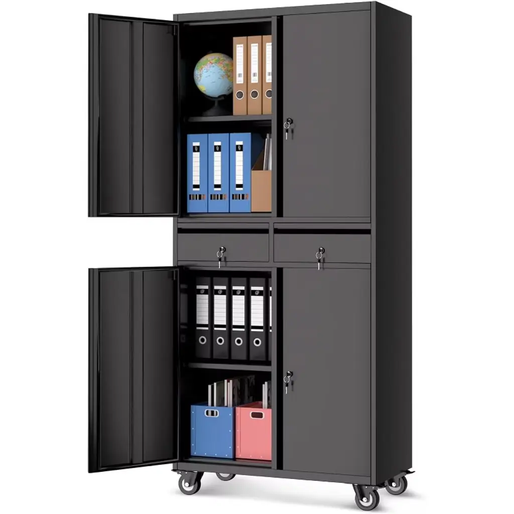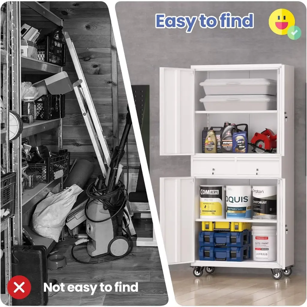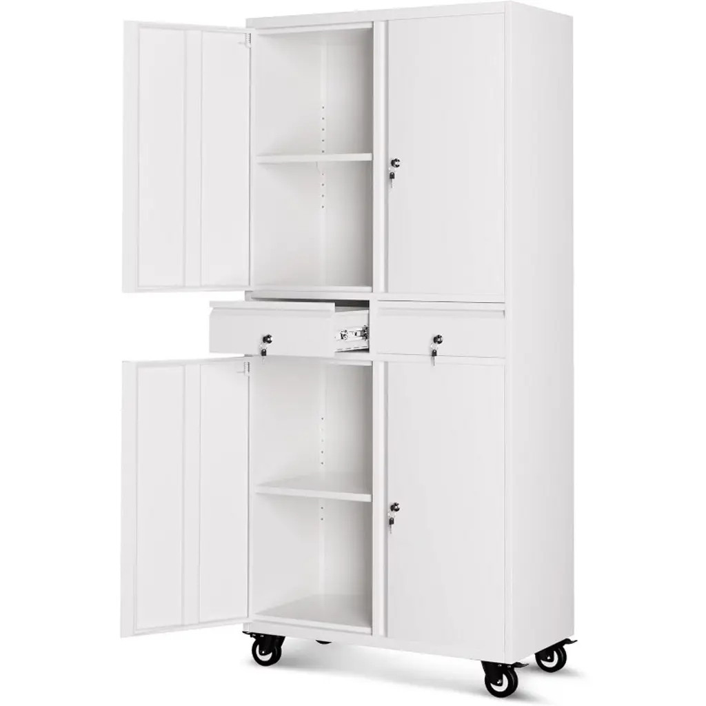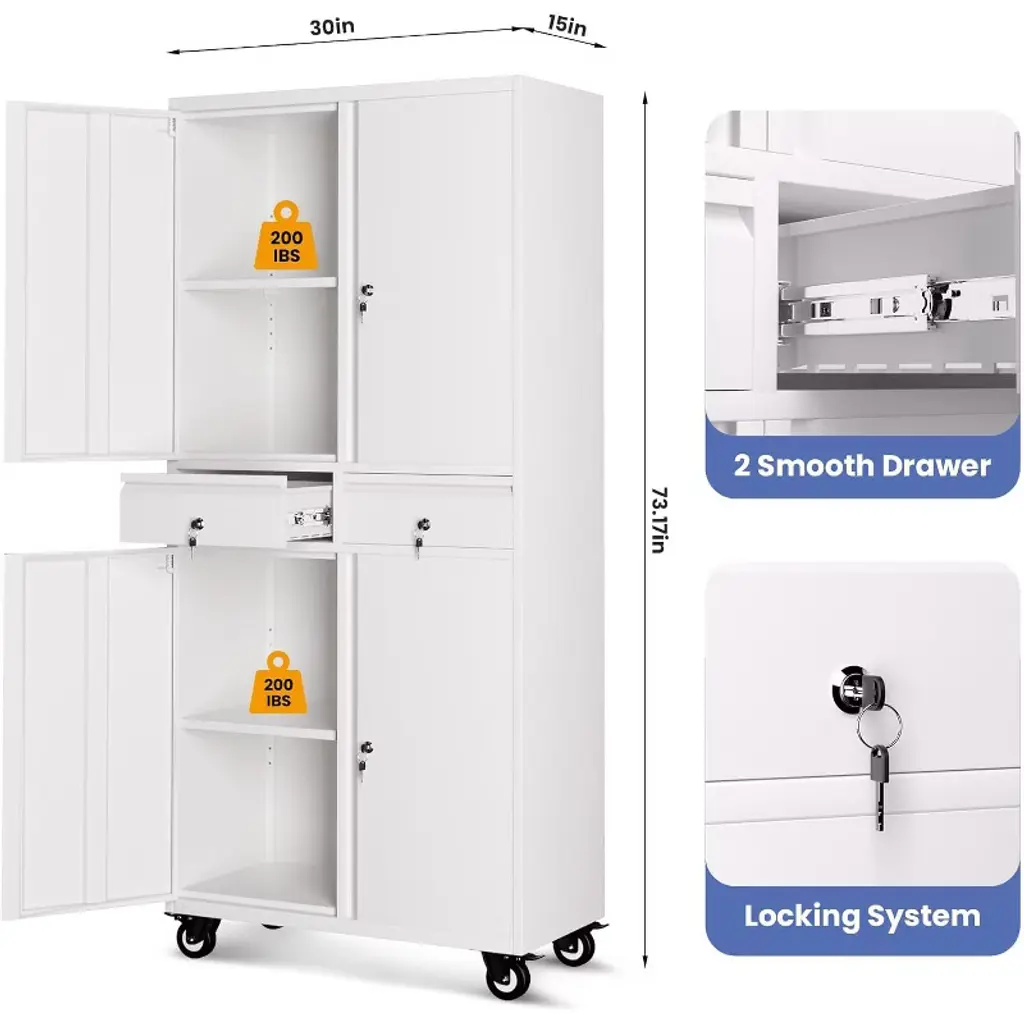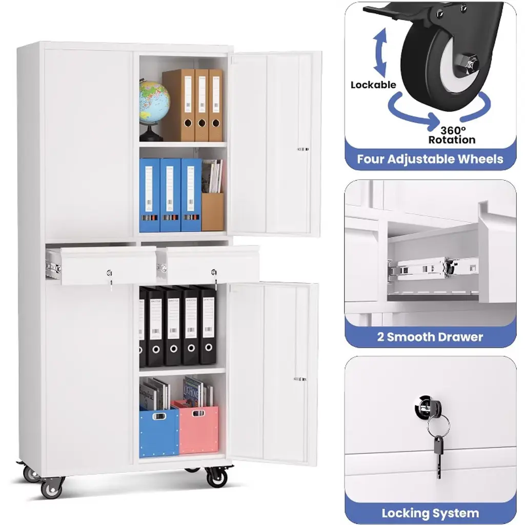 73'' Heavy-duty Metal Storage Cabinet With Wheels, Locking Doors + 2 Drawers & Adjustable Shelves - Garage, Workshop, Office,white