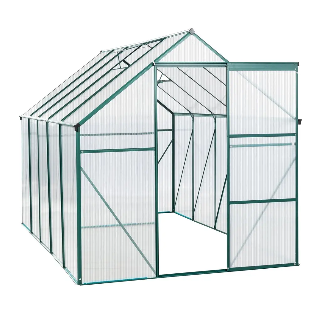 Aluminum is a lightweight yet sturdy metal that provides stable structural support while reducing overall weight, making greenhouse structures easier to install and move.Polycarbonate panels have excellent transparency, allowing a large amount of sunlight to pass through and evenly distributed in the greenhouse, promoting plant growth and prosperity.[Drainage System & Galvanized Base] The drainage gutter system can effectively drain water from the greenhouse to the outside. The sloped roof won't accumulate water on the top. alvanized base can be better fixed in the soil and protects the greenhouse from bad weather.[Sliding Door] The sliding door makes you easier to get in and out, also protects your plants or flowers from animals or pets getting inside. All detailed instruction are included already, so you can simply follow instruction to assemble.[Adjustable Roof] An adjustable roof is convenient for insects to come inside to collect pollen, helping to sow seeds and also providing fresh air at all time. A great ventilation system is built for your plants.[Heavy-duty & Durable Frame] The 4mm thick polycarbonate board can withstand outdoor temperature from -20℃ to 70 ℃, allowing enough sunlight to pass through and isolating most UV rays. The aluminum alloy frame with powder coating is more durable, won't get rust. The panels allow up to 70% light transmission for optimal plant growth while blocking out over 99.9% of harmful UV rays.[Walk-in Spacious Greenhouse] The ideal growing environment is large enough for you to plant numbers of plants, flexibly arrange your plants and flowers inside. Protecting your plants from frost and excessive heat, the green house creates a greenhouse effect to achieve and the best results of planting.
