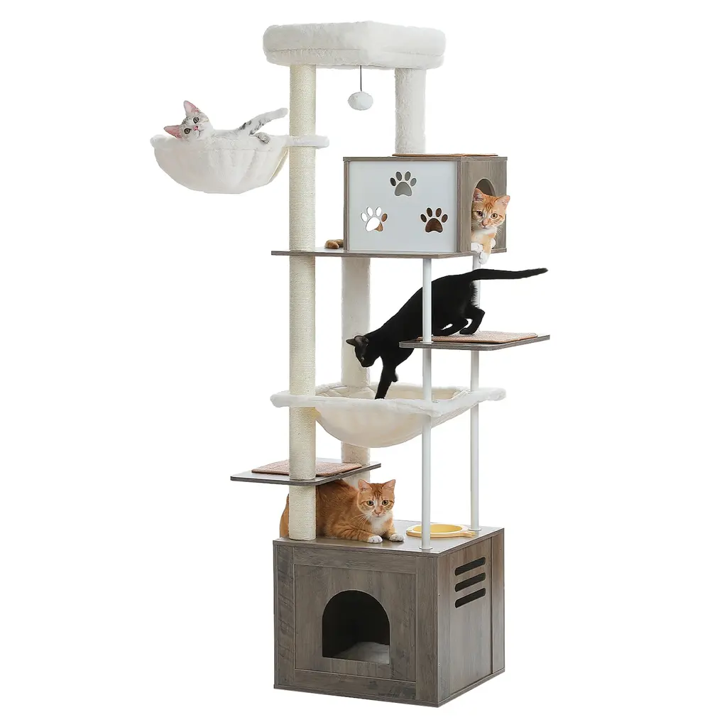 74.8 Inches Wooden Cat Tree, Cat Tower With Food Station, Condos & Hammocks, Spacious Perch & Scratching Mat - Grey