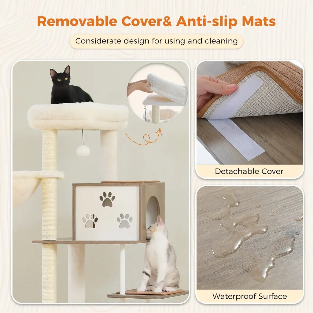 Elevate your cat's comfort and entertainment with our Premium Cat Tree with Food Station. This exceptional 74.8-inch wooden cat tower is designed to provide a wide range of activities and amenities for your indoor large cats. Large and Spacious Design: This cat tree measures 74.8 inches in height, providing ample space for your feline friends to explore, play, and relax. The oversized condo at the bottom can comfortably accommodate 2-3 cats, offering a cozy hideaway for rest or hide-and-seek. Integrated Food Station: The innovative design of this cat tree includes a food bowl positioned above the bottom condo, allowing easy access to food and water for your cats. Now you can conveniently combine their play area and feeding station in one place. Removable and Washable Accessories: The two soft plush cushions in the condo are detachable and washable, providing a hygienic and cozy resting spot for your furry friends. Simply remove and clean them whenever needed, ensuring a clean and comfortable environment for your cats. Premium Materials: Crafted with high-quality materials including steel pipes, boards, cardboard tubes, plush fabric, and sisal, this cat tree offers superior durability and longevity. Please note that the product color may slightly vary from the images shown. If you have any questions, feel free to contact us for more information. Sthick sisal-wrapped poles, the heavy and reinforced base ensures excellent stability and durability. With three anti-slip pads, this cat tree offers enhanced stability, preventing any accidents while your cats climb and play.