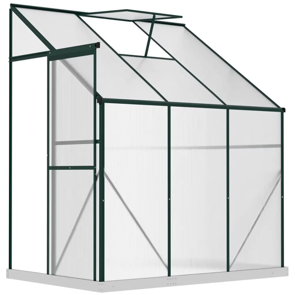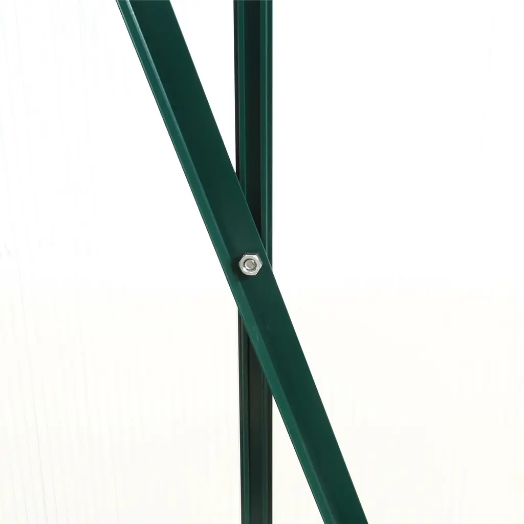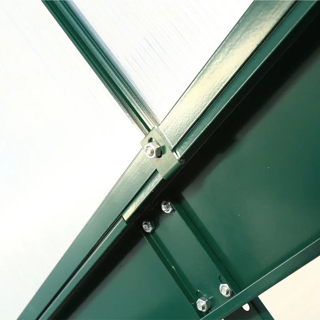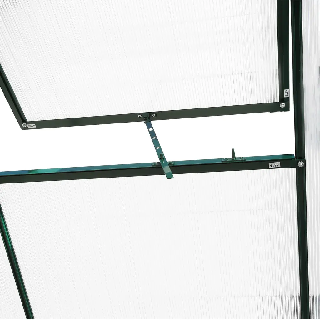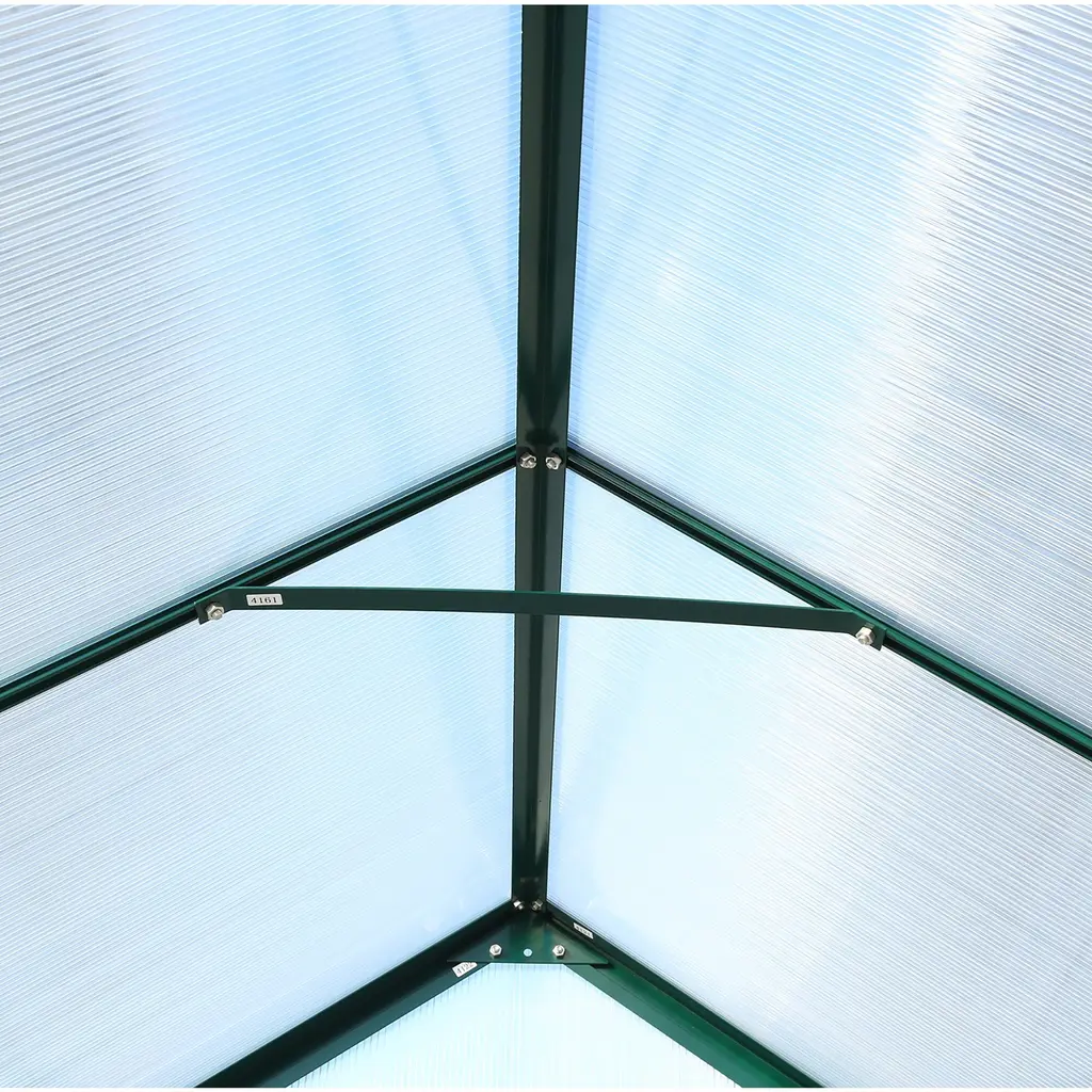 Aluminum is a lightweight yet sturdy metal that provides stable structural support while reducing overall weight, making greenhouse structures easier to install and move.Polycarbonate panels have excellent transparency, allowing a large amount of sunlight to pass through and evenly distributed in the greenhouse, promoting plant growth and prosperity.[Durable Polycarbonate Construction] Our greenhouse features transparent polycarbonate panels that offer superior insulation, elevating humidity and blocking harmful UV rays. This ensures that your plants receive nourishing sunlight while maintaining a conducive growing environment.[Efficient Rooftop Ventilation] The hinged rooftop vent allows excess heat and humidity to escape gradually, creating optimal growing conditions inside the greenhouse. You can easily regulate the internal airflow to support the healthy growth of your plants.[Convenient Sliding Door] The sliding door provides effortless access for moving planters, tools, and equipment into the outdoor greenhouse. Whether you need to ventilate or secure the greenhouse, the sliding door offers practical functionality.[Water-Resistant and Sturdy Design] Our outdoor greenhouse is constructed with aluminum and a galvanized steel base, ensuring a water-safe build and enhanced structural strength.
