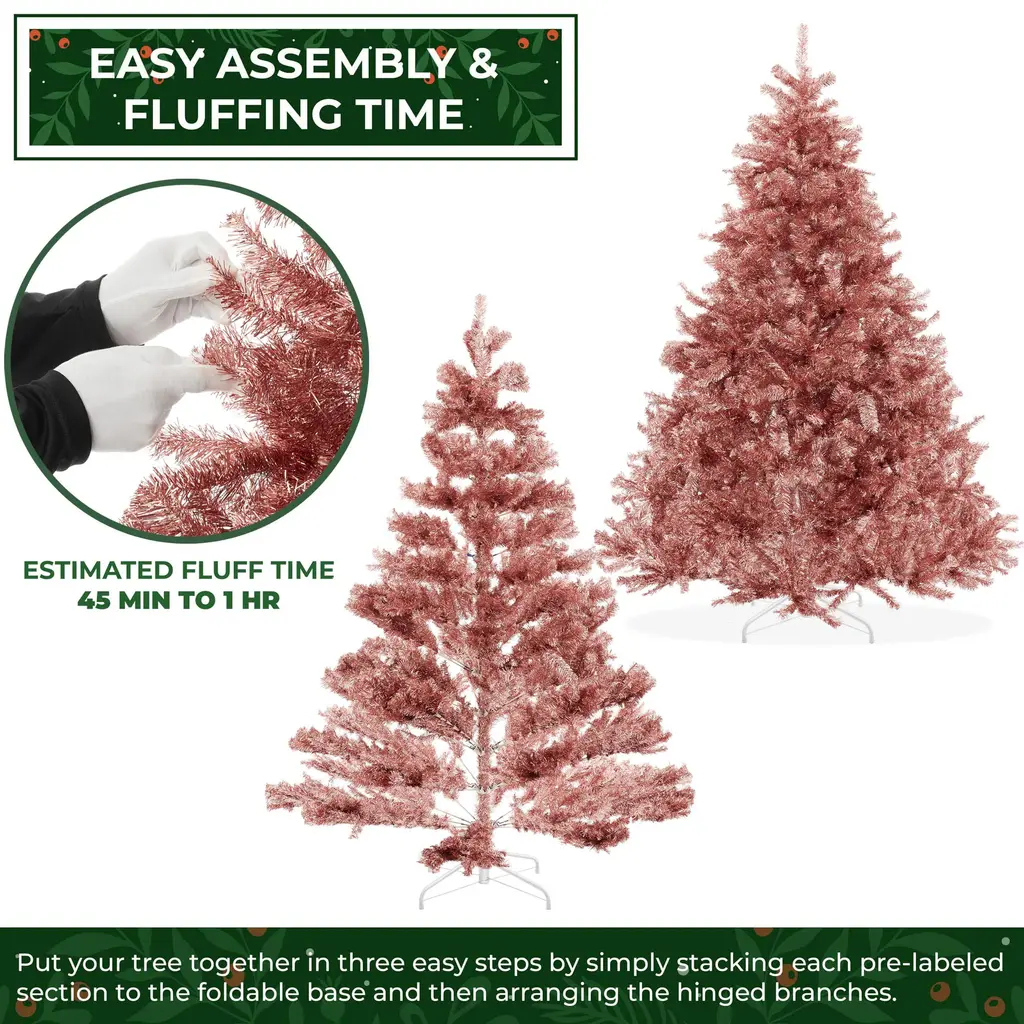 Extremely realistic: This true-to-life 7.5-foot tree contains over 1,800 individual branches and needles. This craftsmanship and detailed design make this the most realistic artificial Christmas tree in its class. Inspire holiday cheer this season with this unique rose gold tinsel color is perfect for Christmas, and other festive events. Its full lush shape is a perfect backdrop for your holiday decorations.Premium quality: Designed and constructed using the newest manufacturing technology and highest-quality materials, our holiday trees create the illusion of genuine, fresh-cut, spruce trees. Faux (fake) Christmas trees are the best value, as they are affordable and will last for holiday seasons to comeBuilt to last: Constructed with premium grade materials, the branches and needles are both flame retardant and non-allergenic. Features hundreds of individually crafted, pre-attached, hinged branch tips with durable metal hingesIncludes Sturdy Metal Stand: This tall Christmas tree stands straight on its foldable metal base. Integrated rubber feet help keep the tree in place and your floors scratch-free.Easy assembly and takedown: Put your tree together in three easy steps by simply stacking each pre-labeled section to the foldable base and then arranging the hinged branches. For its most lush and full form, please set aside 45 - 60 minutes to properly shape the tree. Simply pull down and arrange the branches to your preference, with the included protective gloves. If you are looking for a touch of luxury this Christmas, this is the tree you’ve been looking for! Its bright rose gold color will make your holiday decorations pop and sparkle for Valentine's Day, Christmas, and other festive events. This true-to-life trees' craftsmanship and detailed design make this the most realistic artificial Christmas tree in its class. Built using the newest manufacturing technology and highest-quality materials, our holiday trees create the illusion of genuine, fresh-cut, spruce trees. Faux (fake) Christmas trees are the best value, as they are affordable and will last for holidays to come. The branches and needles are both flame retardant and non-allergenic. This tall Christmas tree stands straight on its foldable metal base. Integrated rubber feet help keep the tree in place and your floors scratch-free. Set up in 3 easy steps; place the base, stack each pre-labeled section, and arrange the branches using the included protective gloves. Specifications: Tree Dimensions: 7.5' High x 63" Diameter Hinged Branches: 1869 Stand: 6" High x 20" Diameter