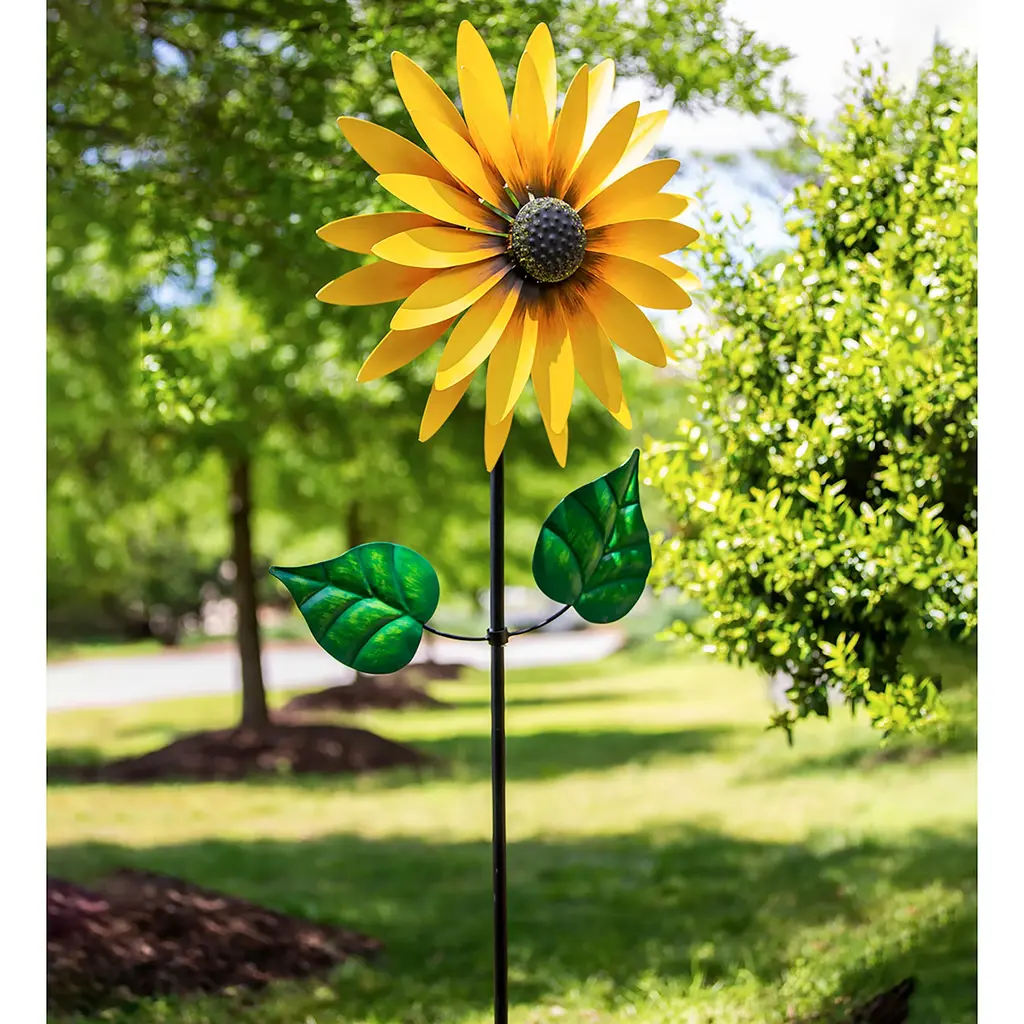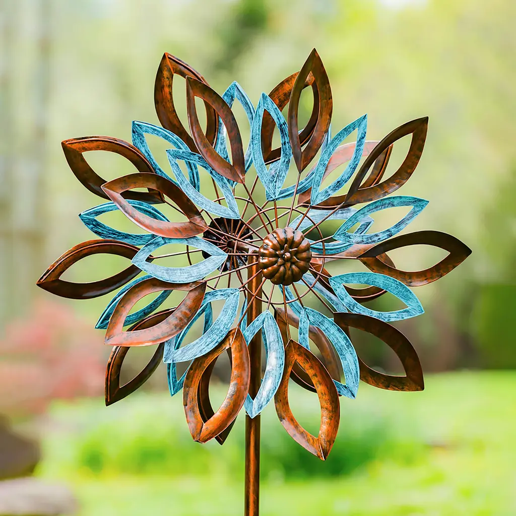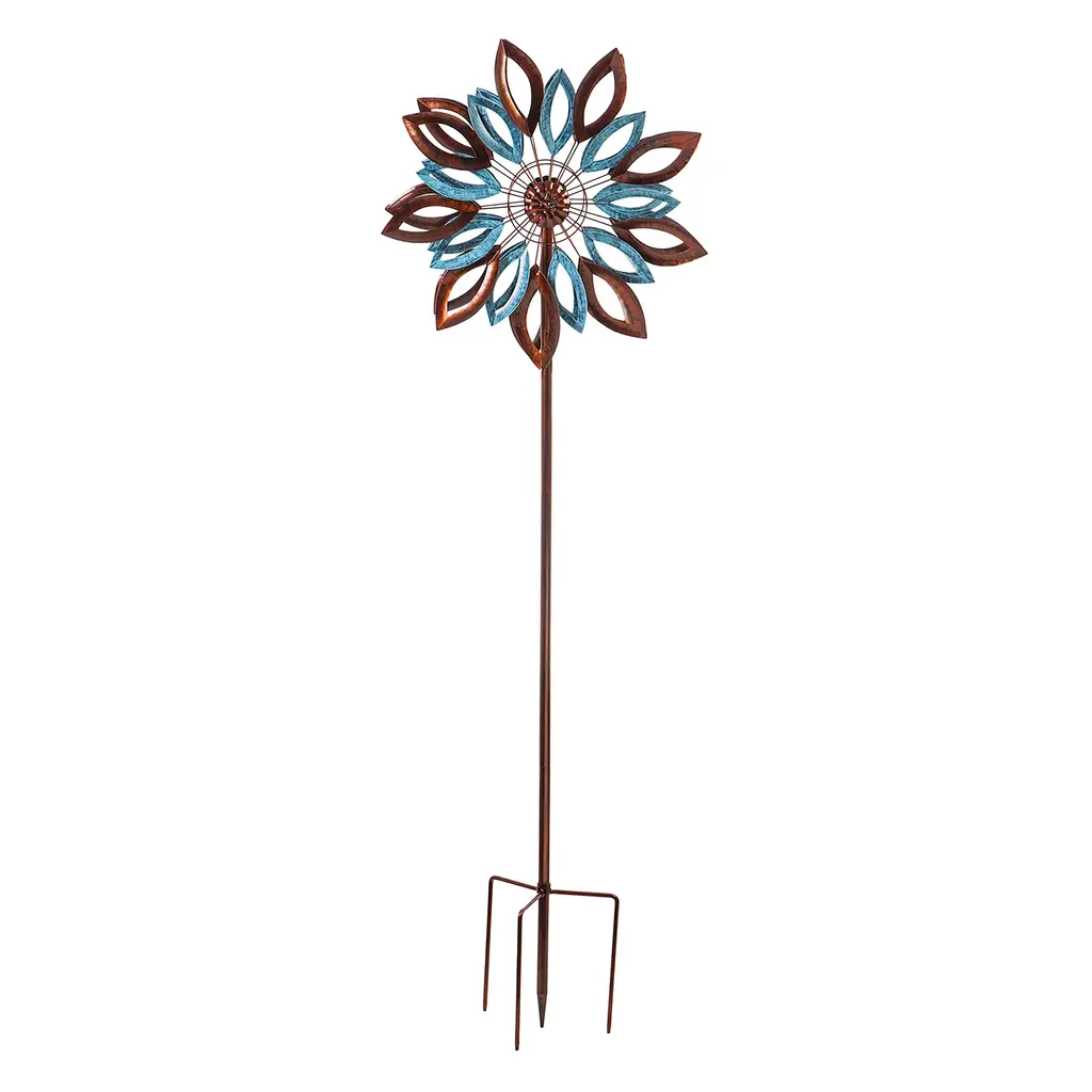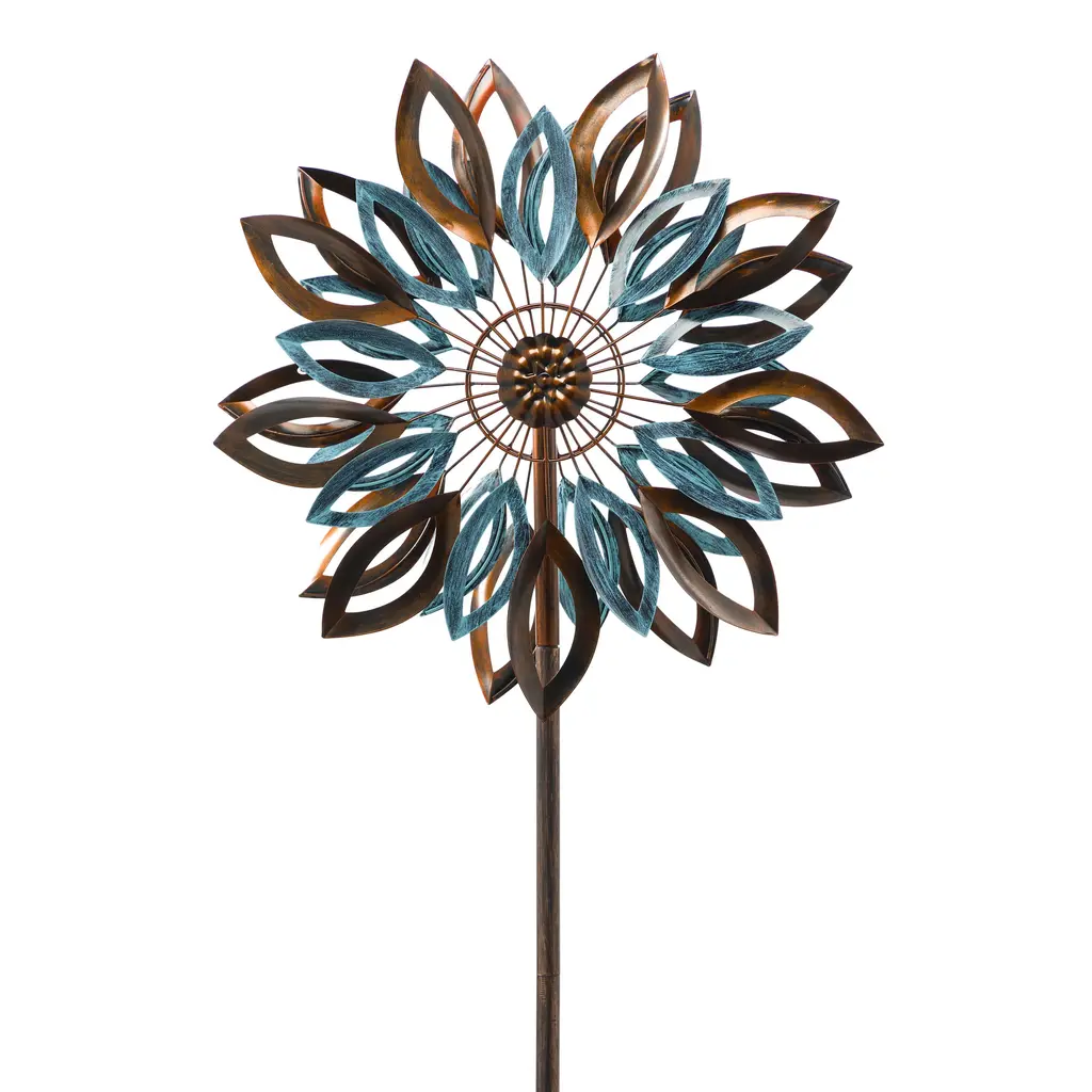 Harness the power of Mother Nature and enjoy the beauty of your outdoor space with this Copper and Verdigris Leaves Statement Wind Spinner. The kinetic comes alive with each passing breeze, producing a mesmerizing visual show. The copper and verdigris finish on the design adds to its rustic appeal for a unique garden statement.The spinner is made of powder-coated metal with a weather- and rust-resistant finish to prevent fading. Easily place the stake anywhere in your garden with the sturdy base.