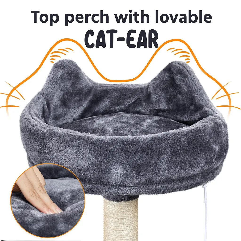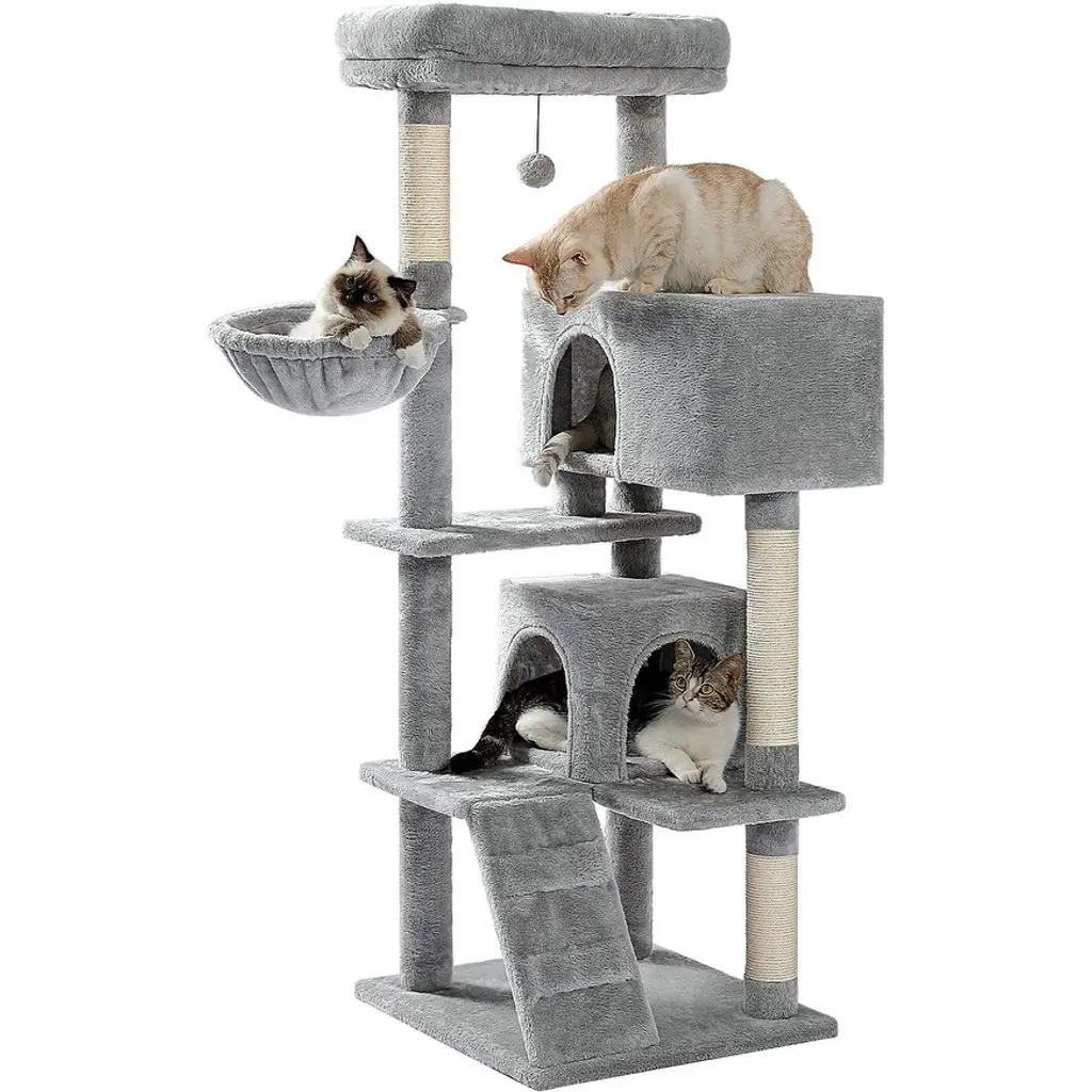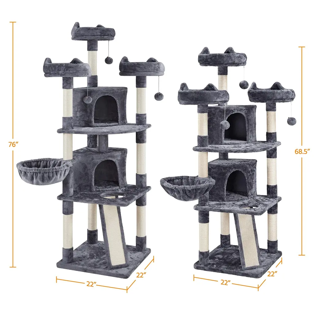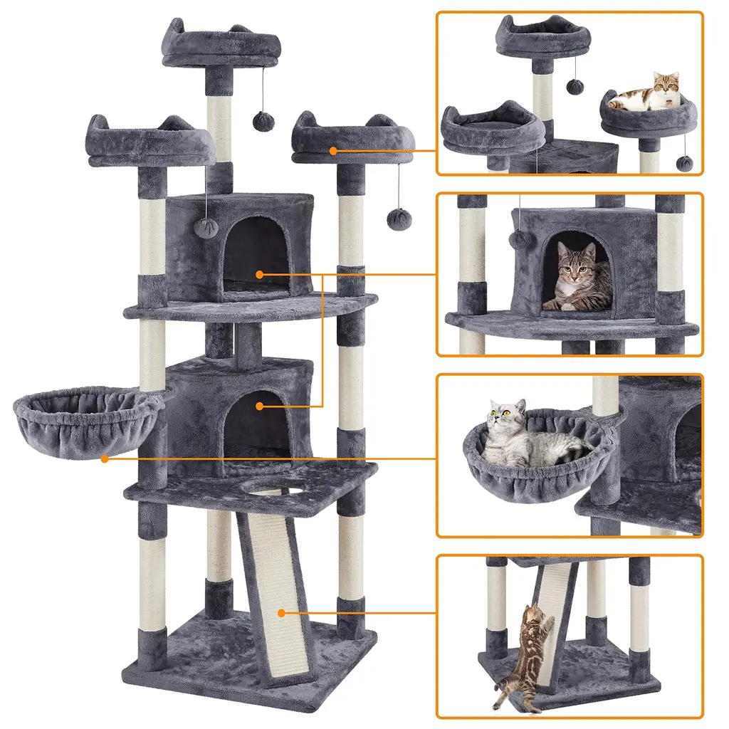 MULTI-LEVEL CENTER: This large cat tree features multiple levels with 3 perches, 2 condos, 1 basket, 8 scratching posts, 1 scratching board, and 3 hanging balls. Multiple levels and layouts make this cat tree interesting and practical, enough for sleeping and playing FOR MORE THAN ONE CAT HOME: This professional cat tree has three perched platforms, two fan-shaped condos, one plush basket, one scratching board, eight scratching posts, and three elastic balls. This large cat tree is suitable for two or three normal-sized cats or several kittens FUNNY COMFY PERCHES: The three perches at the top of the cat tree are designed to be cute and funny in the shape of cat ears. These three small platforms are soft whose padding around edges is PP foam, and to ensure comfort while increasing interest in the cat tree, the edges of the boards have plush hanging balls, which can be removed or replaced with your cats' favorite toys PLUSH CAT TOWER: The whole cat tower is covered by soft plush with durable sisal ropes of the scratching posts and board, which is comfy and practical. Selected materials of the cat tower will ensure you and your cats a long service life DOUBLE STABILITY: To enhance the stability of the cat tree, we use anti-toppling screws, so that you can secure the cat tree to the wall for extra protection. For stability, place the cat tree on a flat floor and in a corner or against the wall, avoid placing it in a humid environment