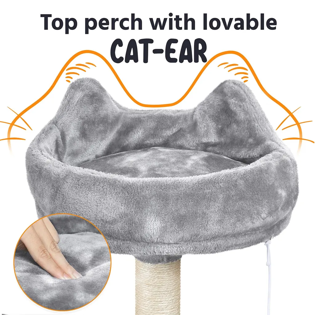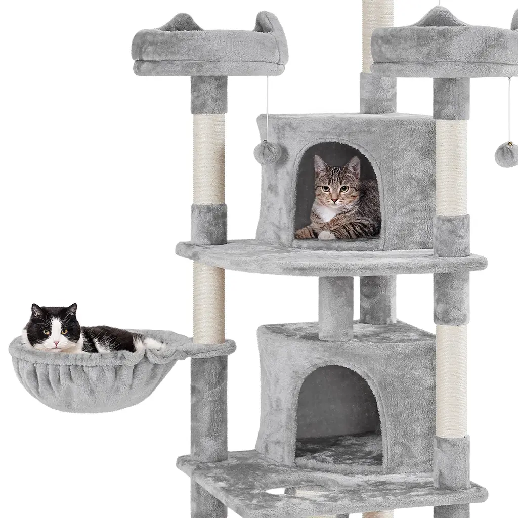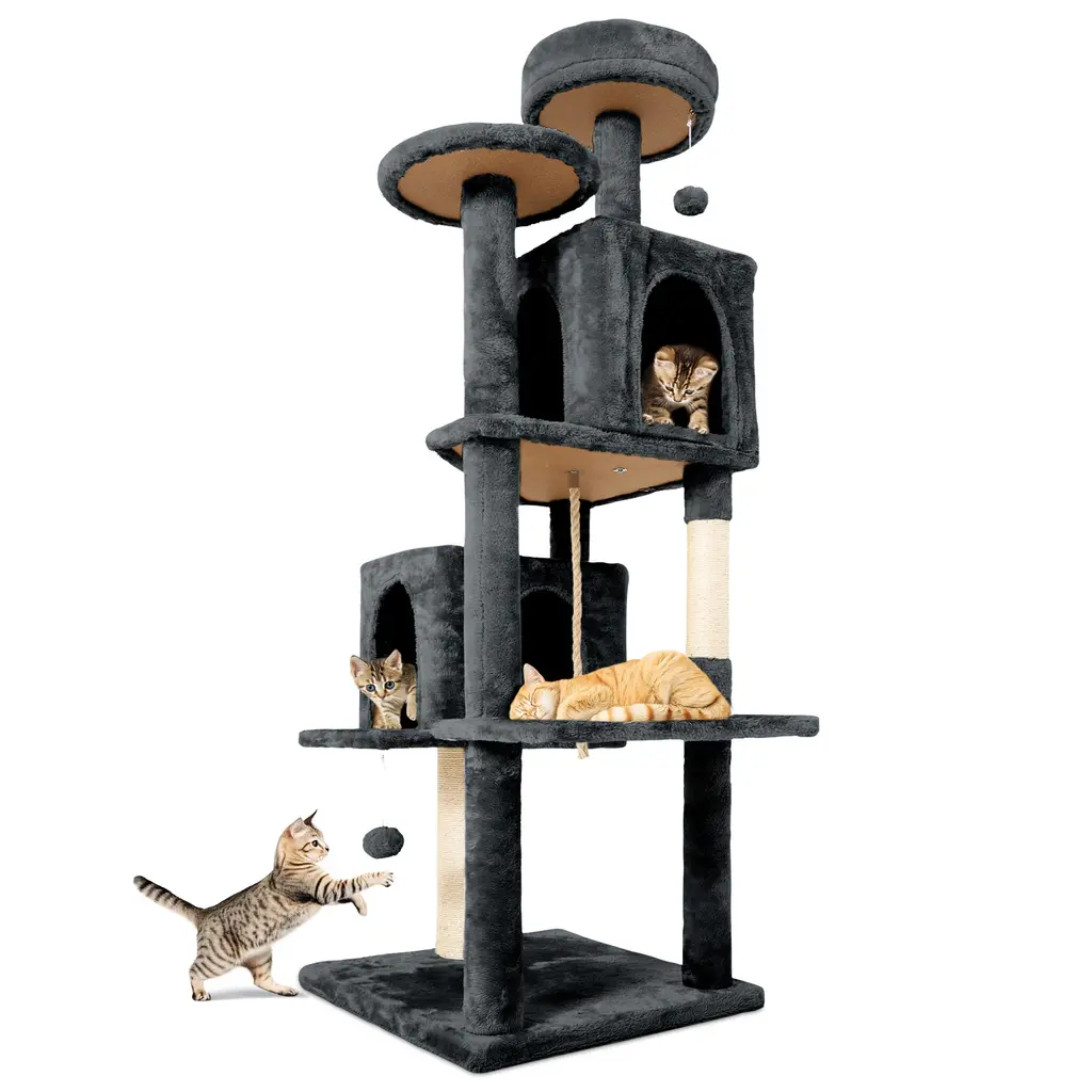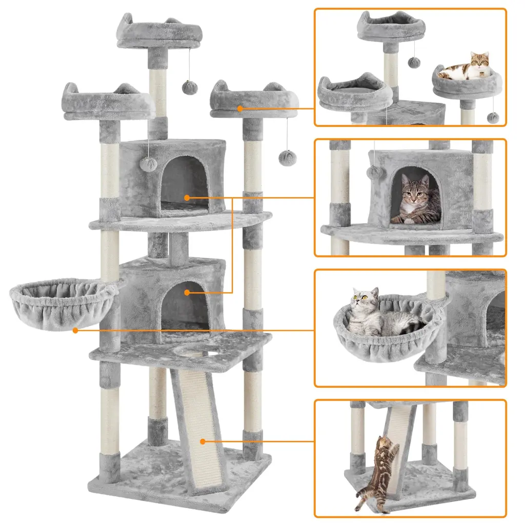 MULTI-LEVEL CENTER: This large cat tree features multiple levels with 3 perches, 2 condos, 1 basket, 8 scratching posts, 1 scratching board, and 3 hanging balls. Multiple levels and layouts make this cat tree interesting and practical, enough for sleeping and playing FOR MORE THAN ONE CAT HOME: This professional cat tree has three perched platforms, two fan-shaped condos, one plush basket, one scratching board, eight scratching posts, and three elastic balls. This large cat tree is suitable for two or three normal-sized cats or several kittens FUNNY COMFY PERCHES: The three perches at the top of the cat tree are designed to be cute and funny in the shape of cat ears. These three small platforms are soft whose padding around edges is PP foam, and to ensure comfort while increasing interest in the cat tree, the edges of the boards have plush hanging balls, which can be removed or replaced with your cats' favorite toys PLUSH CAT TOWER: The whole cat tower is covered by soft plush with durable sisal ropes of the scratching posts and board, which is comfy and practical. Selected materials of the cat tower will ensure you and your cats a long service life DOUBLE STABILITY: To enhance the stability of the cat tree, we use anti-toppling screws, so that you can secure the cat tree to the wall for extra protection. For stability, place the cat tree on a flat floor and in a corner or against the wall, avoid placing it in a humid environment