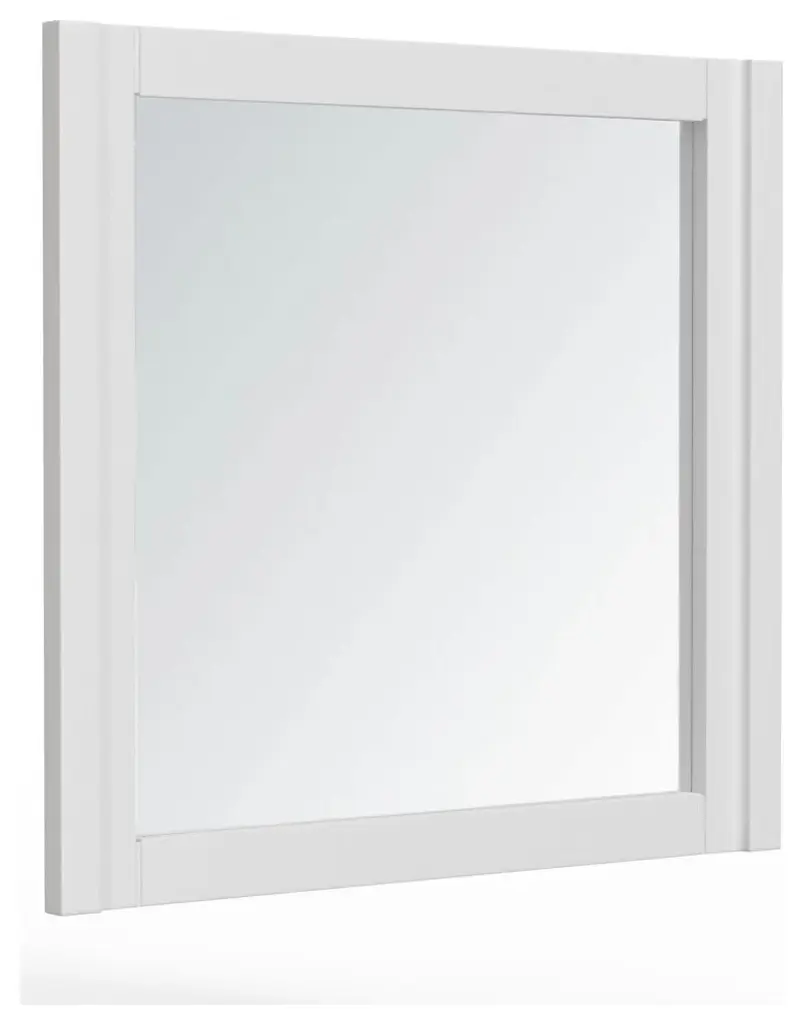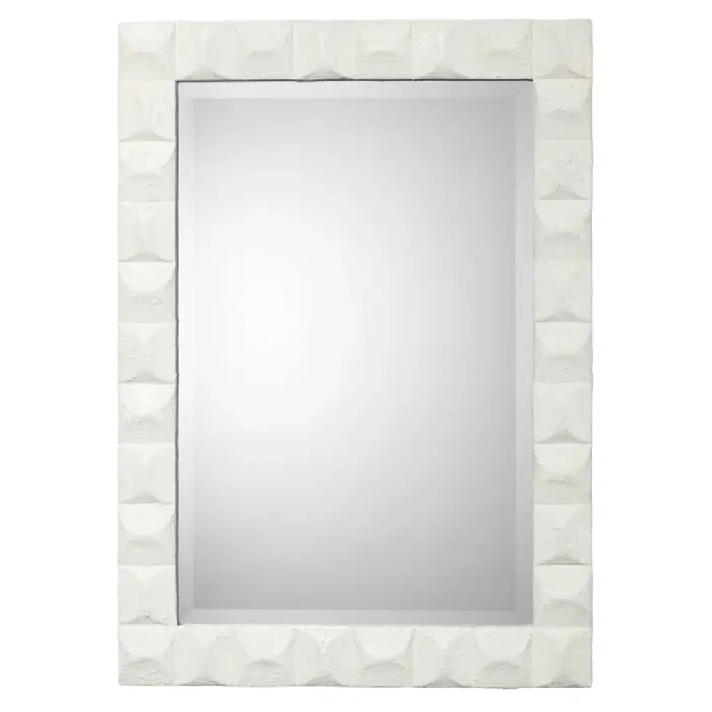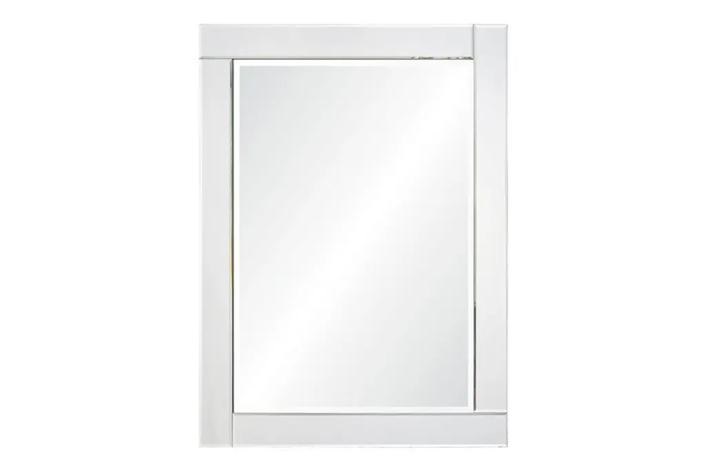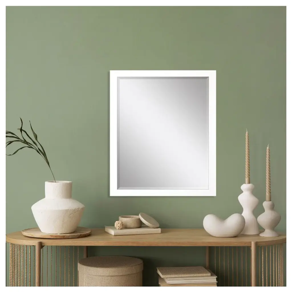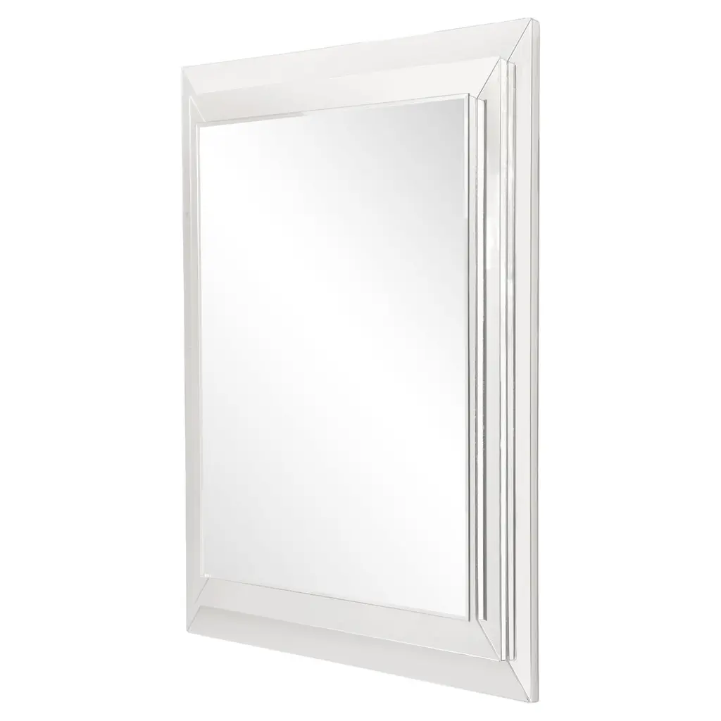 Elegant beveled mirror is framed in a block profile moulding with a matte white finish.