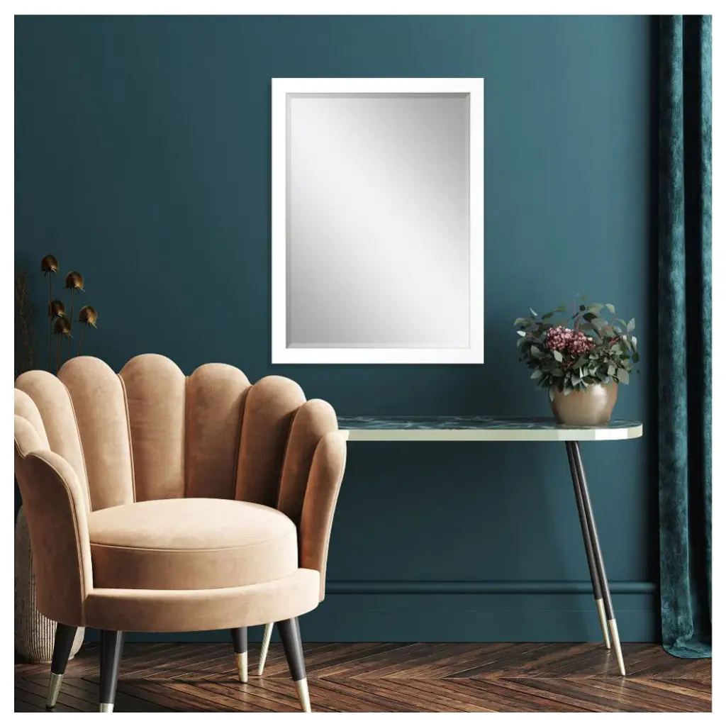 Elegant beveled mirror is framed in a block profile moulding with a matte white finish.