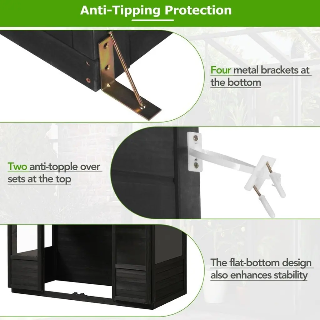 [Walk-in Greenhouse] Crafted from sturdy fir wood, this wooden greenhouse boasts meticulous construction, ensuring an appealing aesthetic. With dimensions of 57.9x29.1x78.1 inches, it provides ample space for people to walk in, making it convenient for tending to various gardening tasks. Double-sided door design makes it easy to go into the roomy interior, which is perfect for accommodating an abundance of plants and essential tools.[Two Folding Middle Shelves] The greenhouse is thoughtfully designed with two shelves. Featuring two folding middle shelves, you have the flexibility to arrange them up or down according to your preference, making organization a breeze. Side shelves offer a practical solution for organizing your plants, providing expansive storage space for you. The shelf height ensures that plants could find a suitable and comfortable spot for growth.[Polycarbonate Panels] Featuring 4 skylights for effective ventilation and a front display window made of polycarbonate panels, this greenhouse prioritizes optimal light penetration. Polycarbonate material enhances transparency, allowing plants to bask in sunlight. The positioned skylights promote excellent airflow, contributing to a well-ventilated environment that fosters the health and growth of the plants within.[Anti-Fall Protection] Four metal brackets at the bottom, coupled with two anti-topple over sets at the top, guarantee stability and top-to-bottom anti-risk capability. The flat-bottom design also enhances stability, eliminating unnecessary rocking. The hollow bottom offers the flexibility to strategically place heavier items in the center, preventing potential structural damage and promoting the greenhouse's long-term durability.[Dimensions and Warranty] Overall dimension: 57.9x29.1x78.1 inch(LxWxH); Middle Shelf: 28.8x13 inch(LxWxH); Side Shelf: 27.2x14.4 inch(LxWxH); Lower Shelf to ground:33 inch. For more size, please refer to the size image. Warm Notice: 3 boxes in total which may not come together.Product Information:Overall Product Dimension:Overall Weight:108.6 lbsWeight Capacity:Material:Fir wood + IronPieces Included:1Assembly Required:YesAdditional Tools Required:All Tools Included