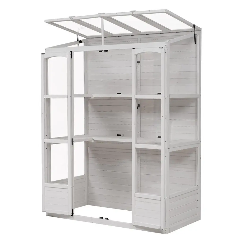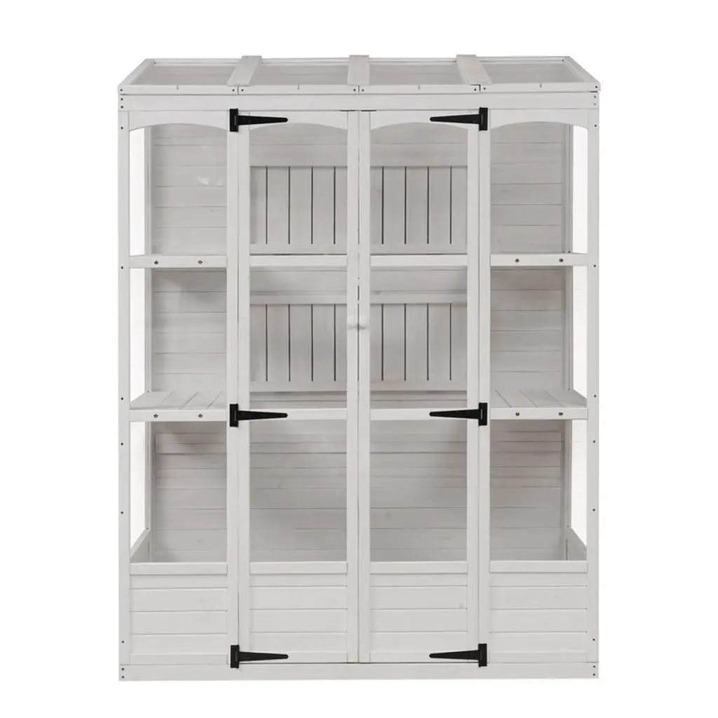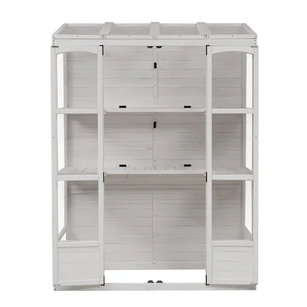 [Walk-in Greenhouse] Crafted from sturdy fir wood, this wooden greenhouse boasts meticulous construction, ensuring an appealing aesthetic. With dimensions of 57.9x29.1x78.1 inches, it provides ample space for people to walk in, making it convenient for tending to various gardening tasks. Double-sided door design makes it easy to go into the roomy interior, which is perfect for accommodating an abundance of plants and essential tools.[Two Folding Middle Shelves] The greenhouse is thoughtfully designed with two shelves. Featuring two folding middle shelves, you have the flexibility to arrange them up or down according to your preference, making organization a breeze. Side shelves offer a practical solution for organizing your plants, providing expansive storage space for you. The shelf height ensures that plants could find a suitable and comfortable spot for growth.[Polycarbonate Panels] Featuring 4 skylights for effective ventilation and a front display window made of polycarbonate panels, this greenhouse prioritizes optimal light penetration. Polycarbonate material enhances transparency, allowing plants to bask in sunlight. The positioned skylights promote excellent airflow, contributing to a well-ventilated environment that fosters the health and growth of the plants within.[Anti-Fall Protection] Four metal brackets at the bottom, coupled with two anti-topple over sets at the top, guarantee stability and top-to-bottom anti-risk capability. The flat-bottom design also enhances stability, eliminating unnecessary rocking. The hollow bottom offers the flexibility to strategically place heavier items in the center, preventing potential structural damage and promoting the greenhouse's long-term durability.[Dimensions and Warranty] Overall dimension: 57.9x29.1x78.1 inch(LxWxH); Middle Shelf: 28.8x13 inch(LxWxH); Side Shelf: 27.2x14.4 inch(LxWxH); Lower Shelf to ground:33 inch. For more size, please refer to the size image. Warm Notice: 3 boxes in total which may not come together.Product Information:Overall Product Dimension:Overall Weight:108.6 lbsWeight Capacity:Material:Fir wood + IronPieces Included:1Assembly Required:YesAdditional Tools Required:All Tools Included