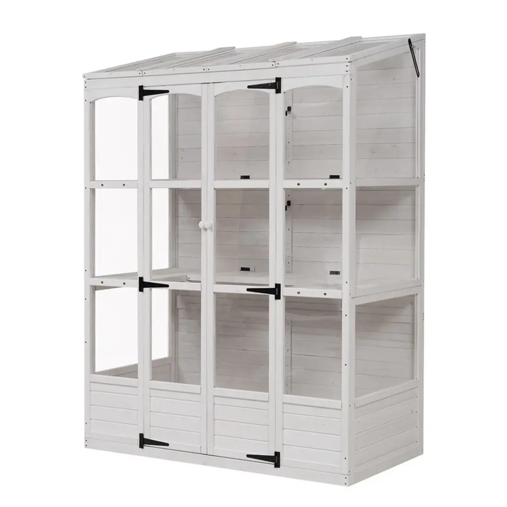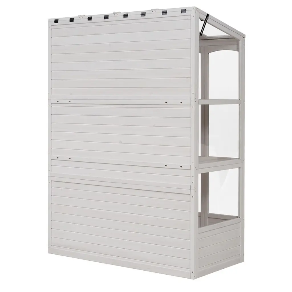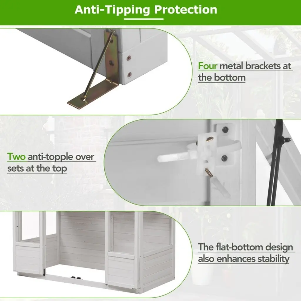 [Walk-in Greenhouse] Crafted from sturdy fir wood, this wooden greenhouse boasts meticulous construction, ensuring an appealing aesthetic. With dimensions of 57.9x29.1x78.1 inches, it provides ample space for people to walk in, making it convenient for tending to various gardening tasks. Double-sided door design makes it easy to go into the roomy interior, which is perfect for accommodating an abundance of plants and essential tools.[Two Folding Middle Shelves] The greenhouse is thoughtfully designed with two shelves. Featuring two folding middle shelves, you have the flexibility to arrange them up or down according to your preference, making organization a breeze. Side shelves offer a practical solution for organizing your plants, providing expansive storage space for you. The shelf height ensures that plants could find a suitable and comfortable spot for growth.[Polycarbonate Panels] Featuring 4 skylights for effective ventilation and a front display window made of polycarbonate panels, this greenhouse prioritizes optimal light penetration. Polycarbonate material enhances transparency, allowing plants to bask in sunlight. The positioned skylights promote excellent airflow, contributing to a well-ventilated environment that fosters the health and growth of the plants within.[Anti-Fall Protection] Four metal brackets at the bottom, coupled with two anti-topple over sets at the top, guarantee stability and top-to-bottom anti-risk capability. The flat-bottom design also enhances stability, eliminating unnecessary rocking. The hollow bottom offers the flexibility to strategically place heavier items in the center, preventing potential structural damage and promoting the greenhouse's long-term durability.[Dimensions and Warranty] Overall dimension: 57.9x29.1x78.1 inch(LxWxH); Middle Shelf: 28.8x13 inch(LxWxH); Side Shelf: 27.2x14.4 inch(LxWxH); Lower Shelf to ground:33 inch. For more size, please refer to the size image. Warm Notice: 3 boxes in total which may not come together.Product Information:Overall Product Dimension:Overall Weight:108.6 lbsWeight Capacity:Material:Fir wood + IronPieces Included:1Assembly Required:YesAdditional Tools Required:All Tools Included