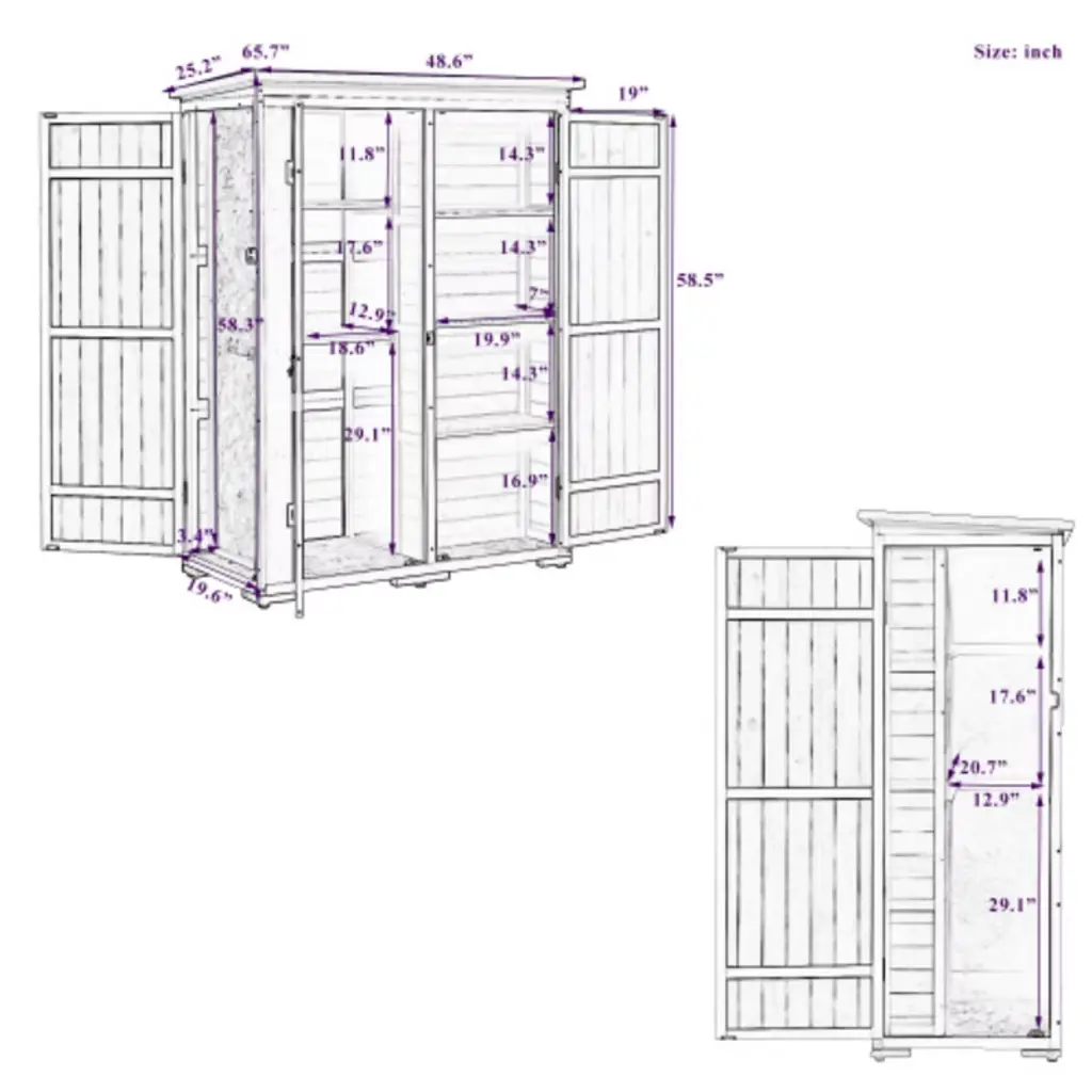 Built from premium fir wood and OSB board, this cabinet boasts exceptional durability with reinforced corners and a robust frame. Its pitch roof and water-resistant coating protect against moisture. The cabinet offers extensive storage with three half-sized shelves for tools and seven compartments for easy access. Security is enhanced with lockable, magnetic doors and adjustable feet for stability on uneven surfaces.