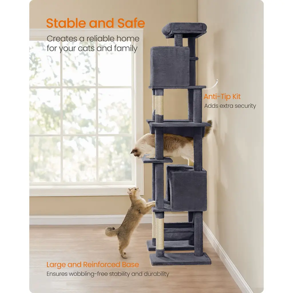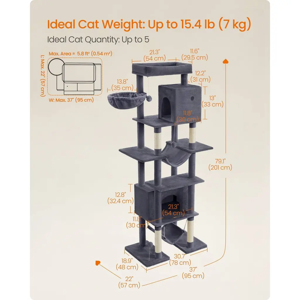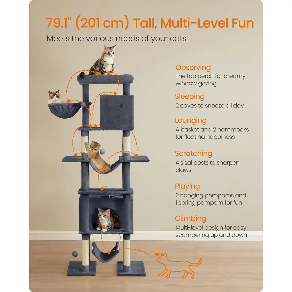 Specifications:Key Features:Description: This multi-level cat tree is a perfect playground for your feline friends, offering a blend of climbing, scratching, and lounging activities. Featuring 4 sisal-covered posts, hanging pompoms with bells, and a spring pompom, it keeps your cats entertained for hours. With ample space, it includes a large perch, 2 cozy caves, 2 plush hammocks, and a basket, ideal for multi-cat households. Standing at 79.1" tall, it provides plenty of room for relaxation. Made from durable particleboard with an anti-tip kit for safety, this easy-to-assemble cat tree is the ultimate cat tower for fun and comfort.