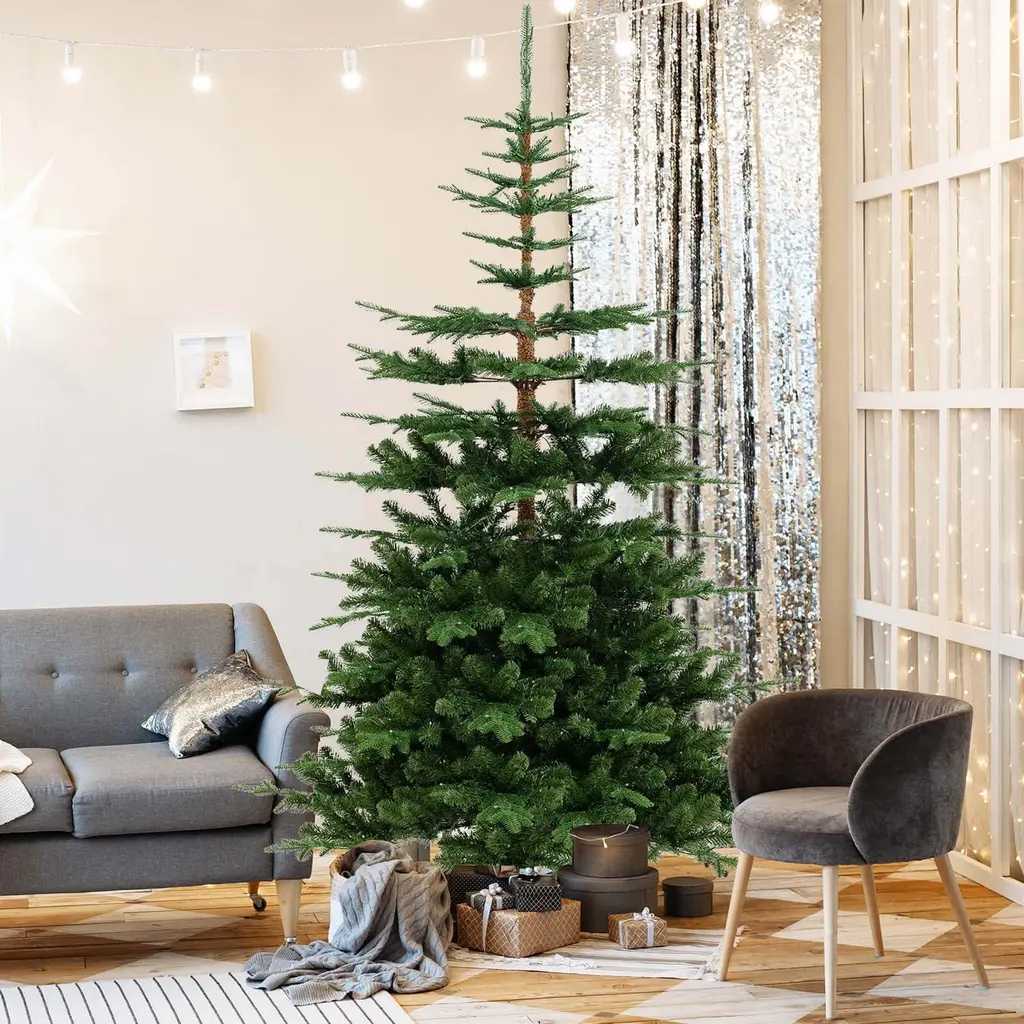 The artificial Xmas tree is a focus point for anywhere! The lighted Christmas tree stands out with its vivid fir-like appearance and a generous count of 1303 lush branch tips. Equipped with 500 warm white LED lights, the faux fir tree offers bright illumination to enhance the festival vibe. Adopting UL listed adaptor, the pre-lit Xmas tree ensures safe use. Crafted with premium PE & PVC, the artificial Christmas tree is flame-retardant and non-allergic. Thanks to its innovative hinged structure, the holiday celebration tree will reduce the time and effort needed for assembly. Moreover, the 7 ft Xmas tree is supported by an upgraded metal stand, which includes a pre-installed bolt to ensure precise hole alignment for easy setup. Whether you're looking to enchant visitors in a commercial setting or bring holiday cheer to your home, this Christmas tree is designed to be a perfect fit. Features:Specification