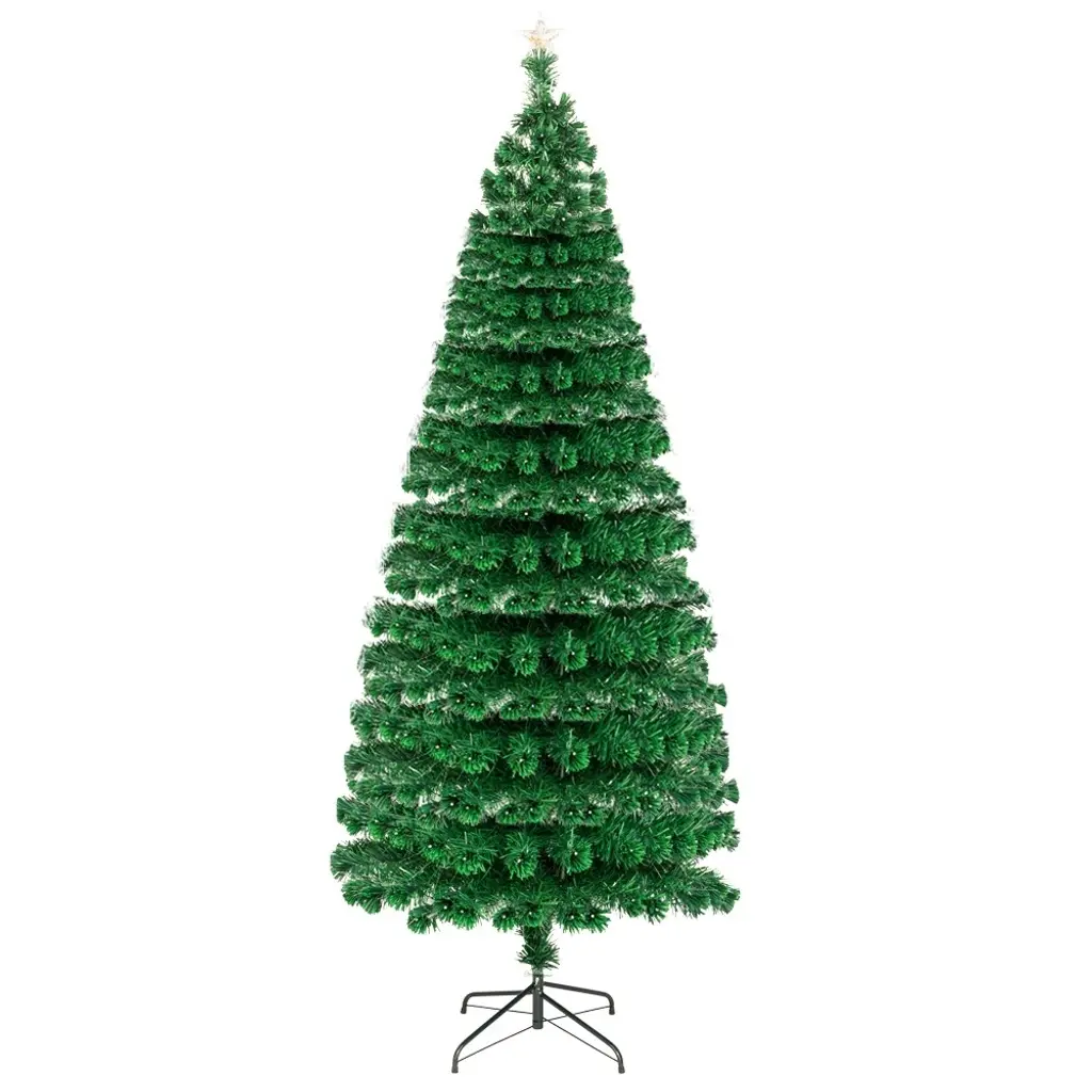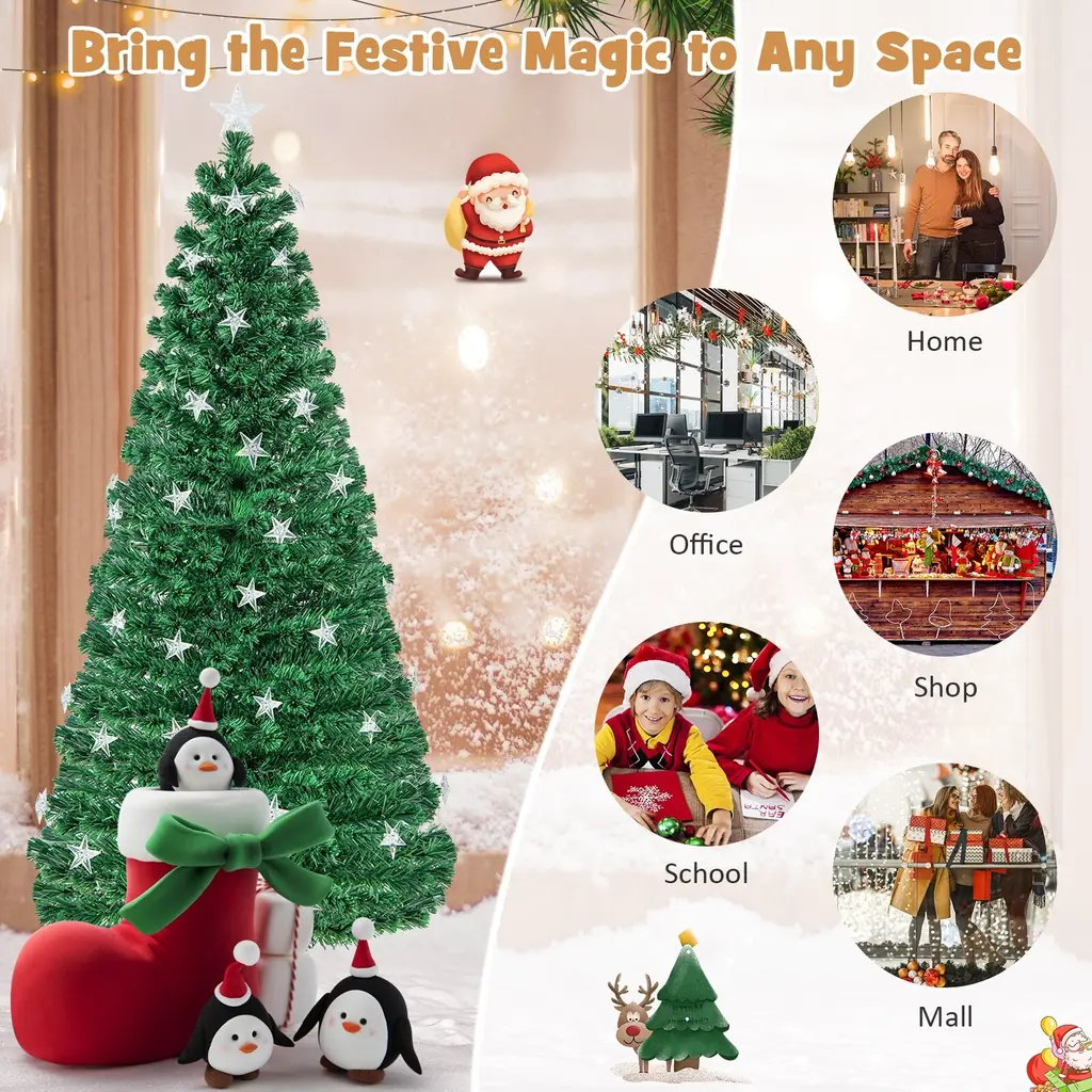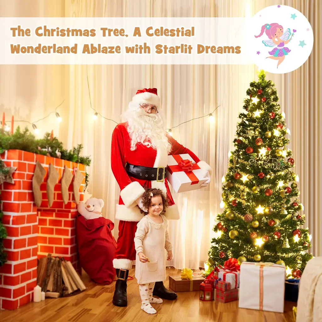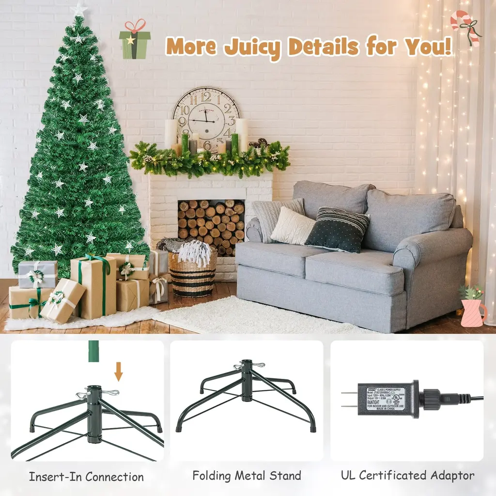 This artificial Christmas Tree, adorned with warm white fiber optic lights and 40 star decorations, is designed to create a stunning visual display. The tree's enchanting ambiance is further enhanced by its versatile lighting options, offering 8 different settings to suit various preferences and occasions. Safety is a top priority, as evidenced by the UL certification of the tree. The tree boasts 280 dense branch tips made from premium PVC material, contributing to a full and realistic appearance. These tips are flame-retardant, odor-free, and hypoallergenic, ensuring a health-conscious design. A foldable, non-slip metal base with a protective cover provides strong support and floor protection. The hassle-free assembly process, guided by a detailed user manual, involves unfolding the base, connecting the tree sections, and adjusting the lights, resulting in an impressive and easy-to-set-up Christmas decoration.Key Highlights:This Christmas tree is ideal for those seeking a unique and enchanting holiday decoration. Its blend of stunning visuals, customizable lighting options, and user-friendly design makes it suitable for various settings, including homes, parties, and ceremonies. The tree's focus on safety and ease of assembly, combined with its striking appearance, ensures it will be a standout feature in any festive decor.