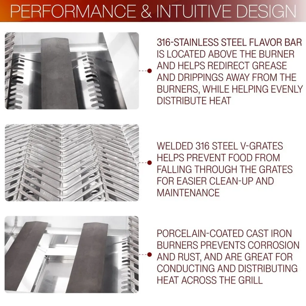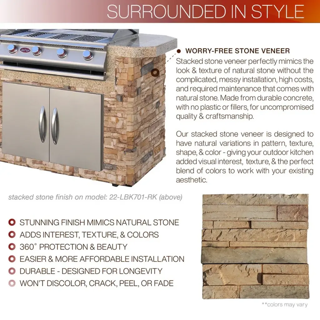Create new memories with Cal Flame's 7ft Stone Veneer Gas Grill Island in Stainless with 4-Burner Propane. This stylish BBQ island combines beauty and performance with a G4 4-burner grill, stainless steel refrigerator, side burner, and 30in. double access doors. The porcelain design countertop with the Stack Stone base adds a touch of elegance to your home resort. Enjoy entertaining outdoors with friends and family, complete with an outdoor umbrella for added comfort. This Liquid Propane grill is ready to use, but requires a licensed contractor to connect any electrical, water, natural gas, or propane hook-ups.Features:Additional Details:
