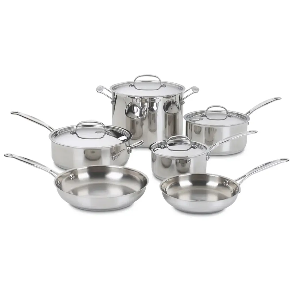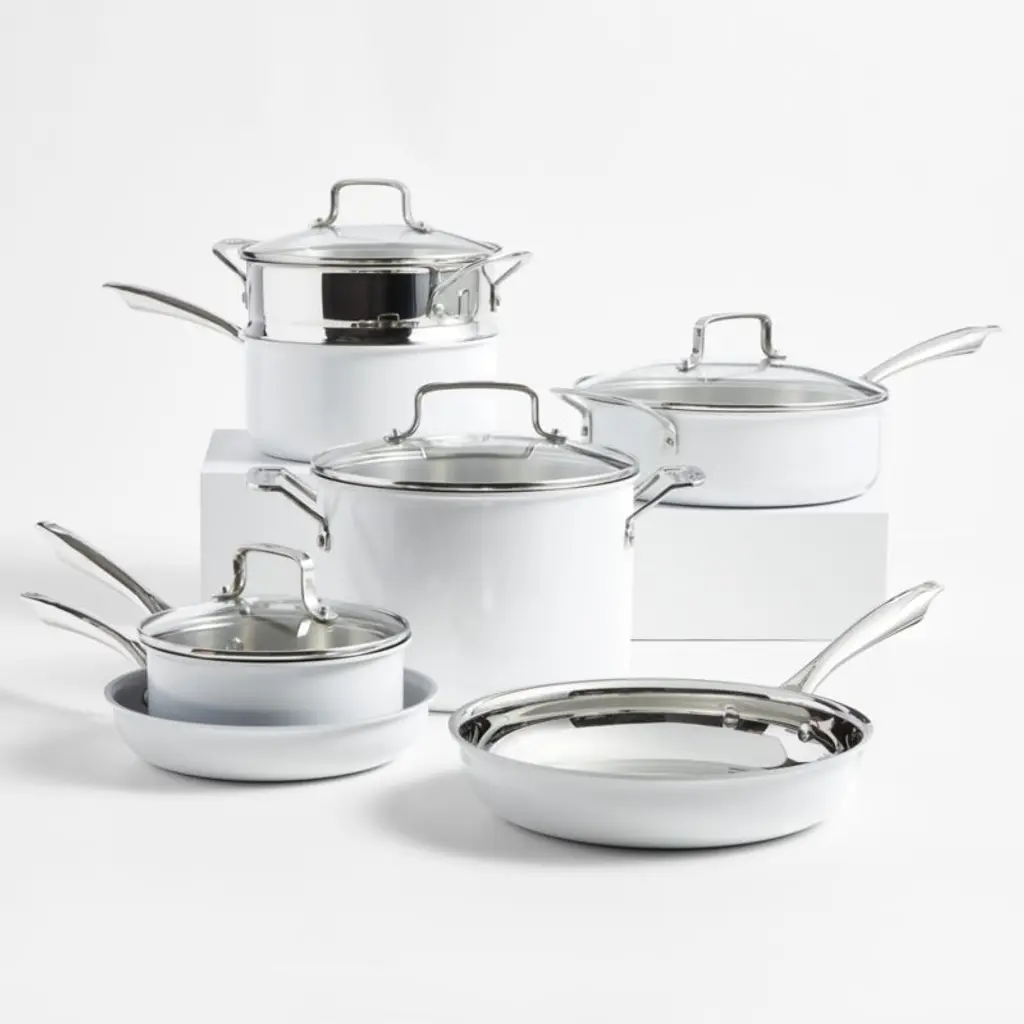 You'll be ready to cook a wide variety of meals with this 7-Piece Stainless Steel Cookware Set from Figmint™. This set includes a frying pan, a sauté pan with lid, a stockpot with lid and a saucepan with lid, all designed in a silver finish, plus pan protectors to prevent scratches during storage. Aluminum cores are fully surrounded by two layers of stainless steel to help distribute heat quickly and evenly, and the surfaces are safe to use with all utensil types. The saucepan features a built-in spout and strainer plus interior volume measurement markings, and all of the pieces are oven safe up to 450 degrees.Figmint™: Mixing up a taste of adventure every day.