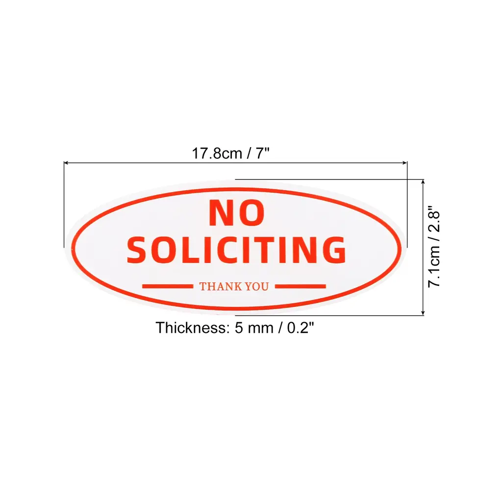 This No Soliciting sign can help you not be disturb by flyer or unwanted people at home, keeping someone knock your house door or sell you product. You can mount it on the door, wall or other smooth and flat surfaces. Suitable to use in the office, home, meeting room or any other private rooms.SpecificationColor: White, RedMaterial: AcrylicThickness: 5 mm / 0.2 inchSize: 7.1 x 17.8 cm / 2.8 x 7 inch (L*W)Packing List: 1 or 2 x No Soliciting SignAdvantage1. Made of durable Acrylic material with smooth and flat surface design, good toughness, tear-resistant and water-proof, not easy to be bent. Even if it gets stained, just wipe it gently with water, easy to clean.2. Adhesive-backed design can adhere well to smooth door surfaces, not easy to slip with strong adhesion;3. Simple design can grasp the attention of the guests at once, helping them know you don't want to be disturb right now, meeting your daily need.Instruction1. Remove the transparent protective film on the front of the sign;2. Then tear off the sticker on the back of the label and stick it on a flat and smooth door or wall.NOTE: Please note that the label needs to be attached on a smooth and clean door or wall surface.