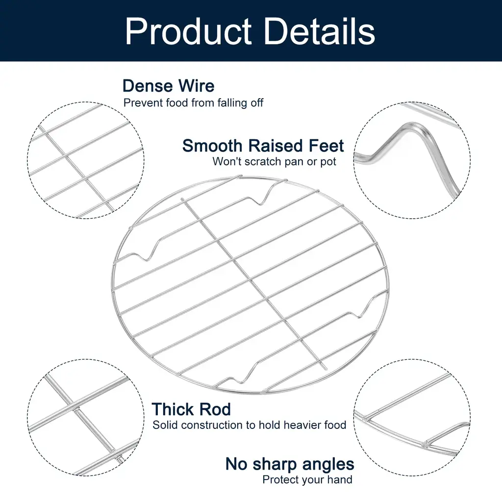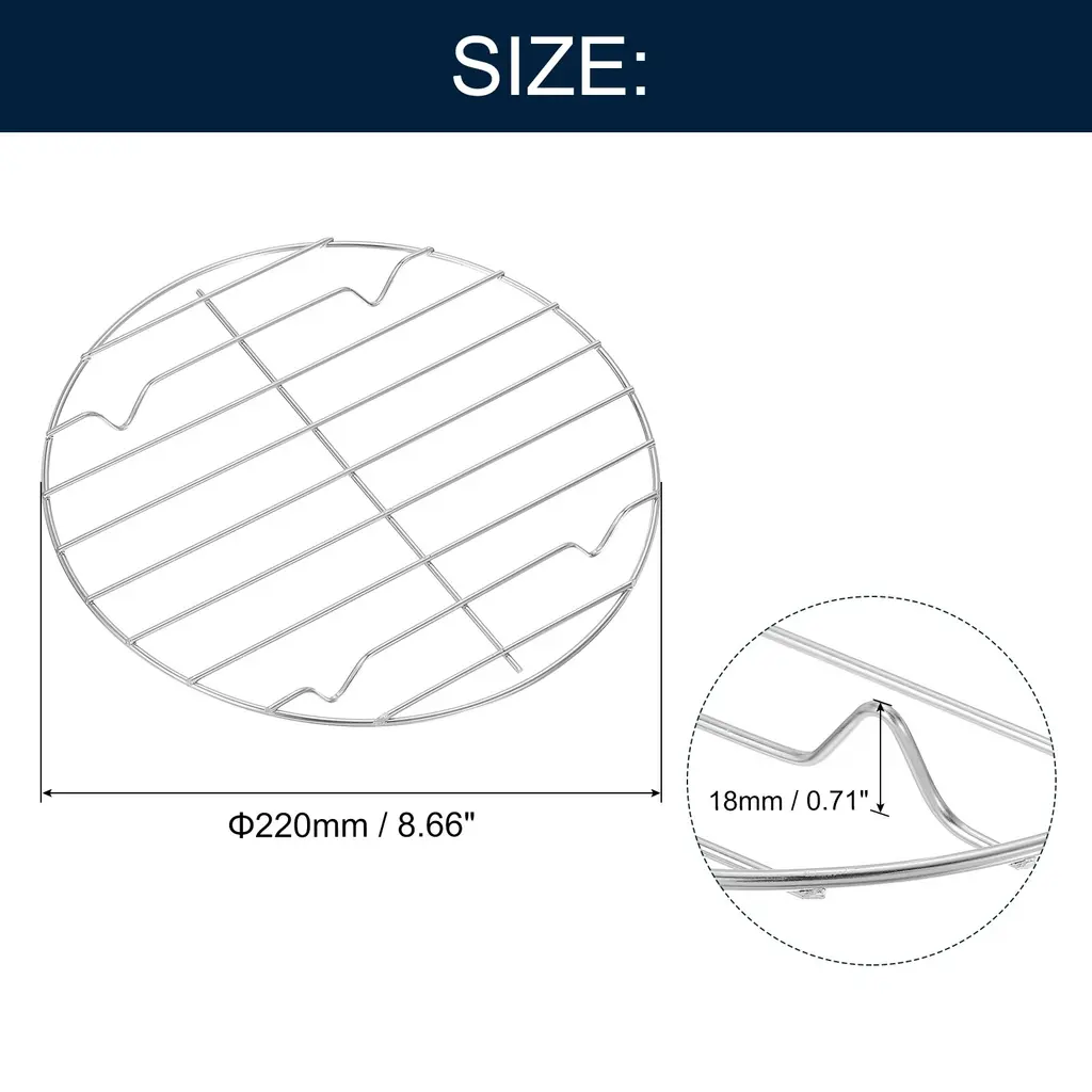 Description:Material - The round cooling rack is made of 201 stainless steel, which is sturdy, can hold heavier food, does not easily fall off, does not easily rust after cleaning, and is suitable for daily use.Design - The 4 raised feet and close parallel line of the round cooking rack can stably hold food and prevent it from falling. And the overall mirror-finished craft is not easy to stick, making it easy to take out food.Feature - The cooking grid grill allows air to circulate on all sides of the food, steaming evenly and cooking quickly, reducing waiting time for cooking. In addition, it is a good tool for layering food and is easy to clean.Widely Applicable - The round roasting rack can be used as an air fryer rack, steaming rack, baking rack, cooling rack, or roasting rack. Suitable for steaming, roasting, or cooling bread, cookies, cupcakes, pizza, and other foods.Specification:@Material: 201 Stainless SteelColor: SilverSize: 220 x 18 mm / 8.66”x 0.71”(Dia x H)Package Content: 1Pcs x Round Cooling Rack