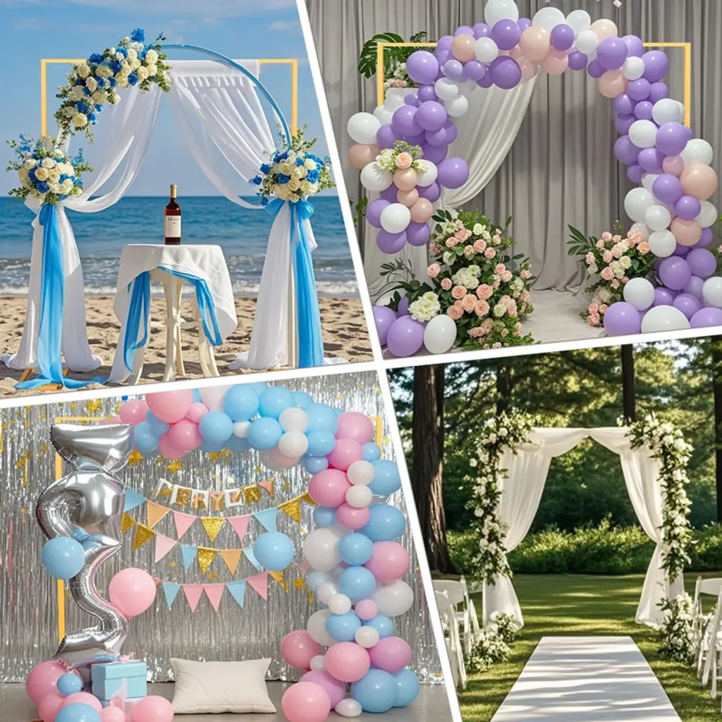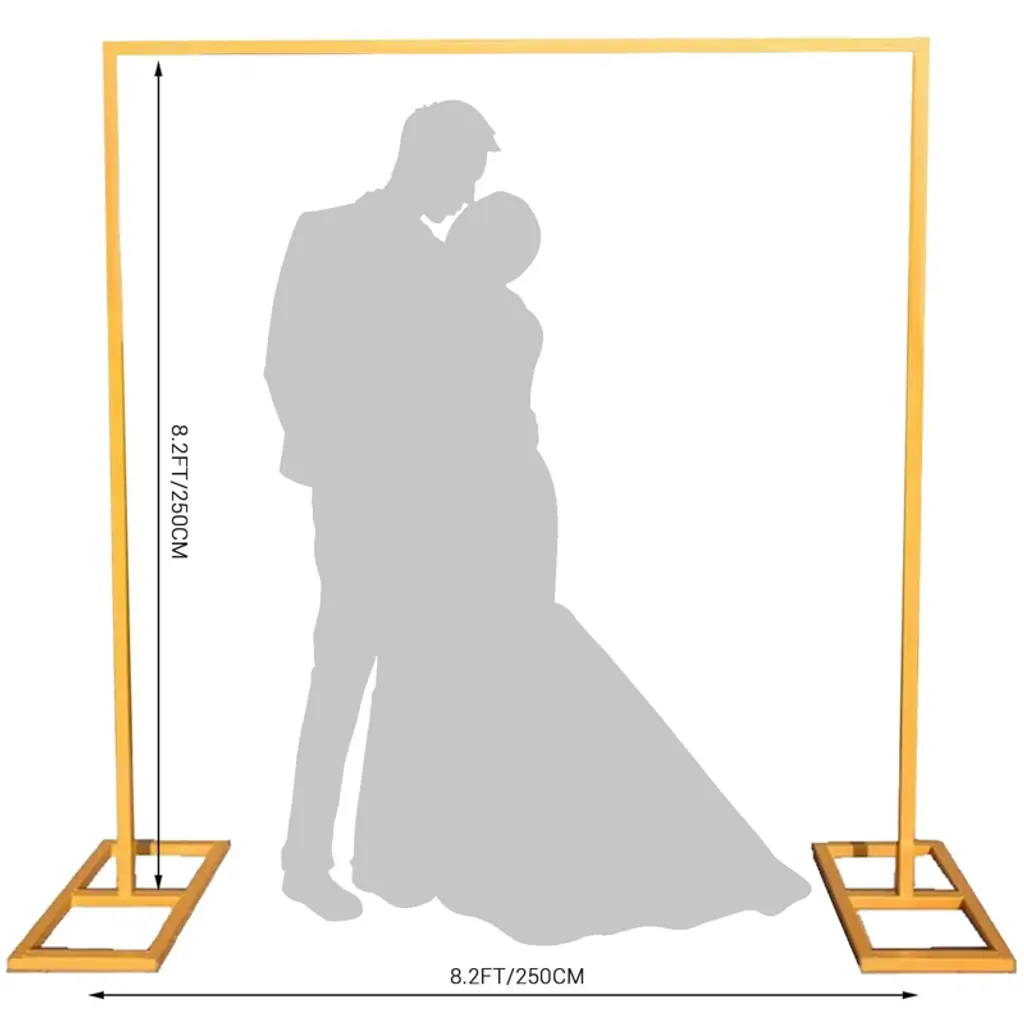Product DescriptionIntroducing the 8.2FT x 8.2FT Metal Arch Backdrop Stand, the perfect addition to your special events and celebrations. Crafted from durable metal, this square arch backdrop stand is designed to provide a sturdy and elegant frame for your decorations. Whether you're planning a wedding, anniversary ceremony, birthday party, or any indoor or outdoor celebration, this square metal arch serves as an ideal backdrop for balloons, flowers, and other decorative elements.Product FeatureDetachable design: Convenient for transportation and storage, easy to assemble and disassemble.Uniform color: The paint process ensures uniform color and exquisite appearance.Rust-proof treatment: The metal material is rust-proofed, durable and suitable for outdoor use.Product information Size: 8.2FTx8.2FT Item Weight: 29.76 poundsMaterial: MetalColor: GoldPacking list:1 x Wedding Arch Backdrop StandNote:Color difference: Due to light or display reasons, the color of the actual product may be slightly different from the picture.Measurement error: Due to manual measurement, there may be some reasonable errors.