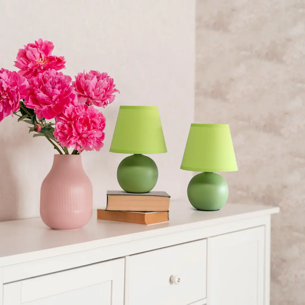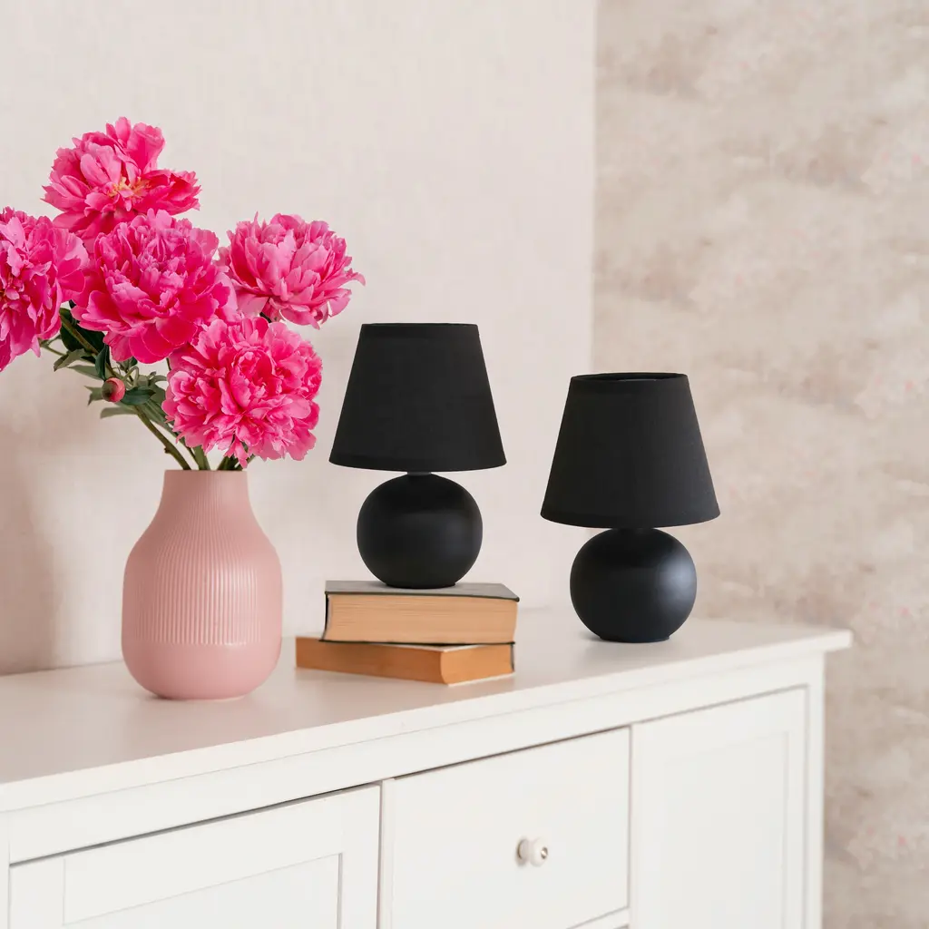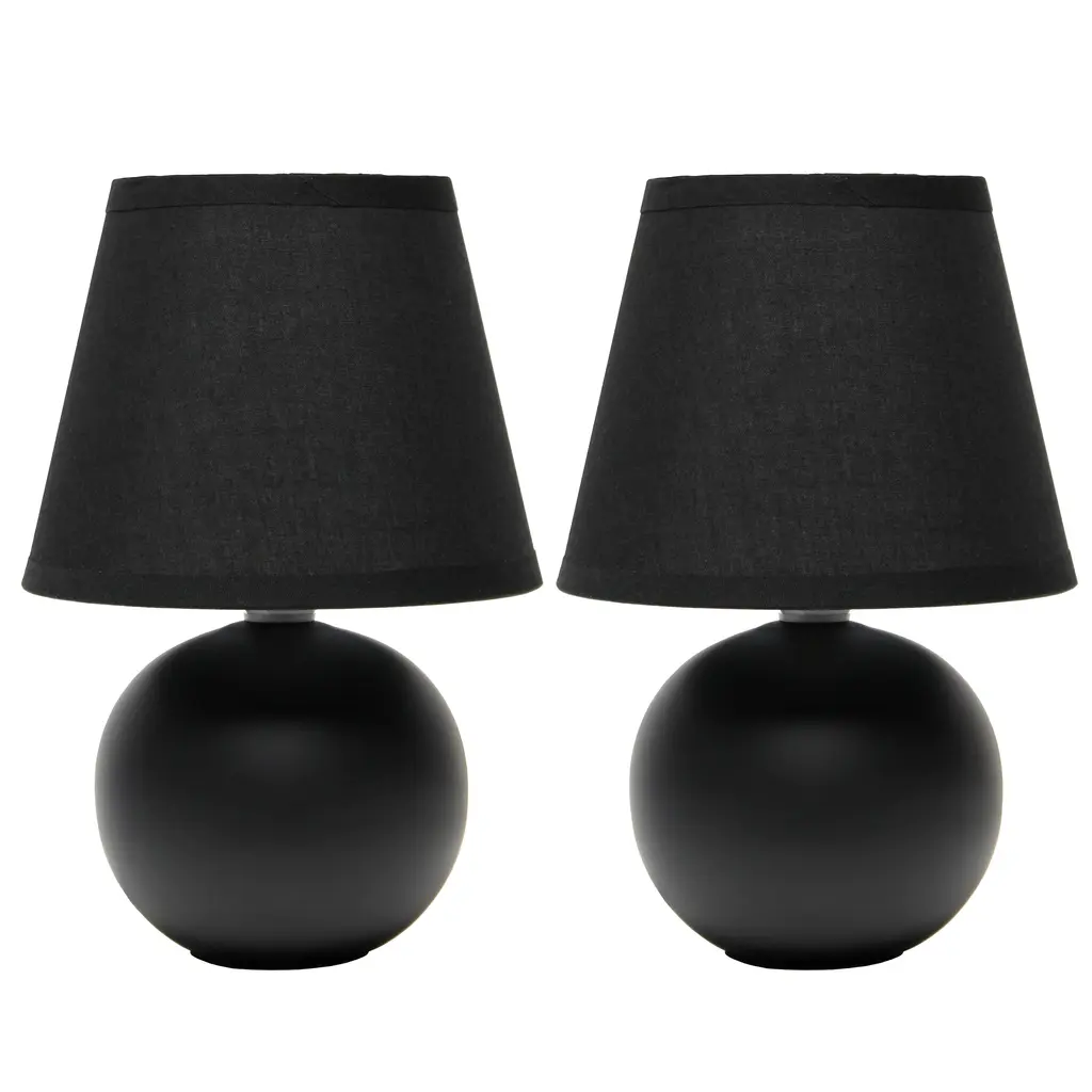 A petite table lamp set, each made primarily of ceramic with its base in the shape of a round orb sits beneath a matching colored tapered fabric shade for an overall effortlessly styled lamp suited for both your décor and lighting needs. A number of color options are available in this style, to compliment your decor just right.Features: