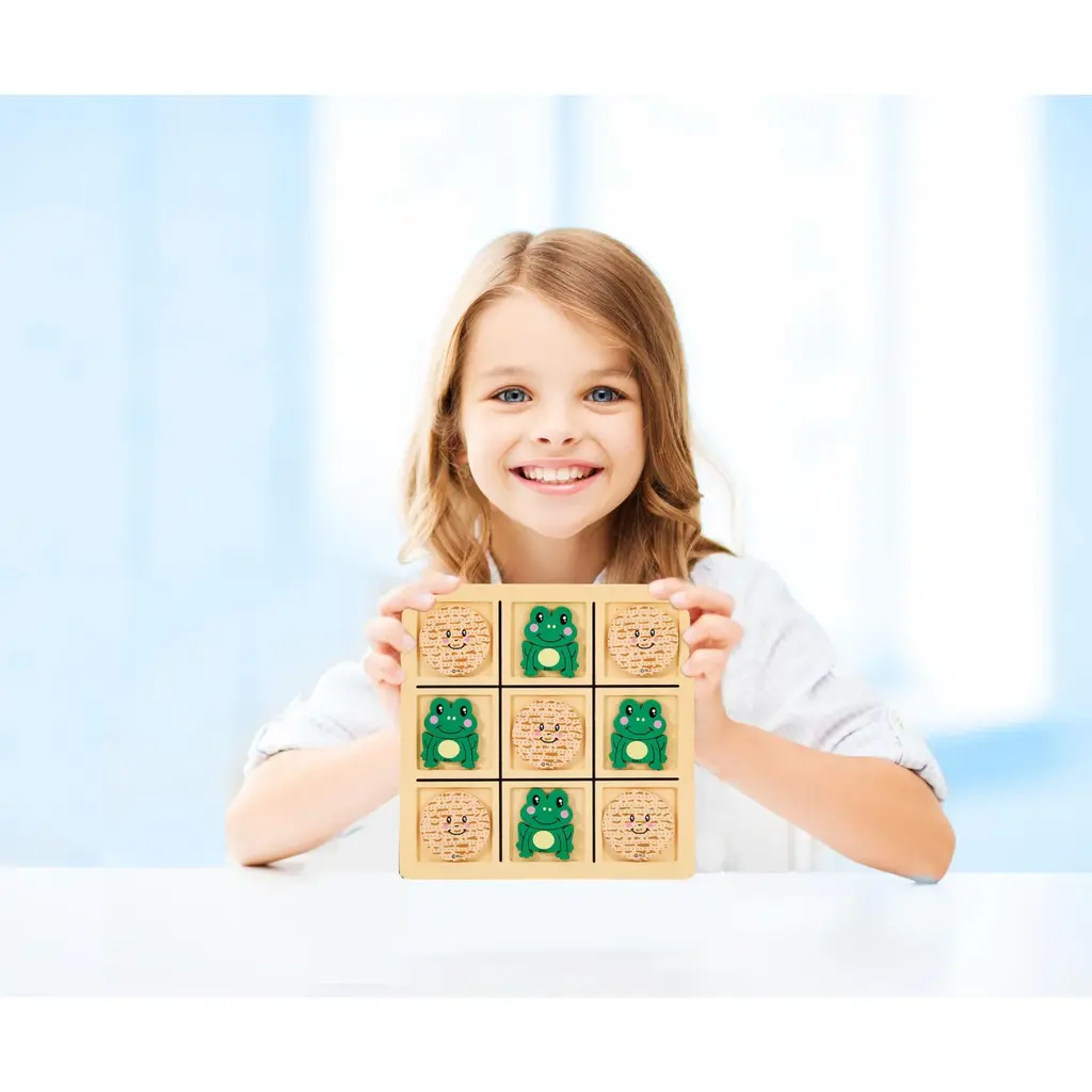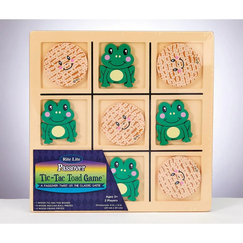 Are you feeling too bored? Get this wonderful toy, featuring frogs and matzas to play the popular game 'Tic-Tac-Toe' and have hours of fun. Go ahead, let the battle begin with a croak! Product Features: Features Passover tic tac toad wood game Provides hours of endless Passover fun Take a leap ahead with this fun game from Rite Lite! Includes 1 wood tic-tac-toe board with groves, 4 frog pieces and 5 matzah ball pieces Perfect for birthday parties or any other special occasion Dimensions: 8"H x 8"W x 8"D Material(s): wood