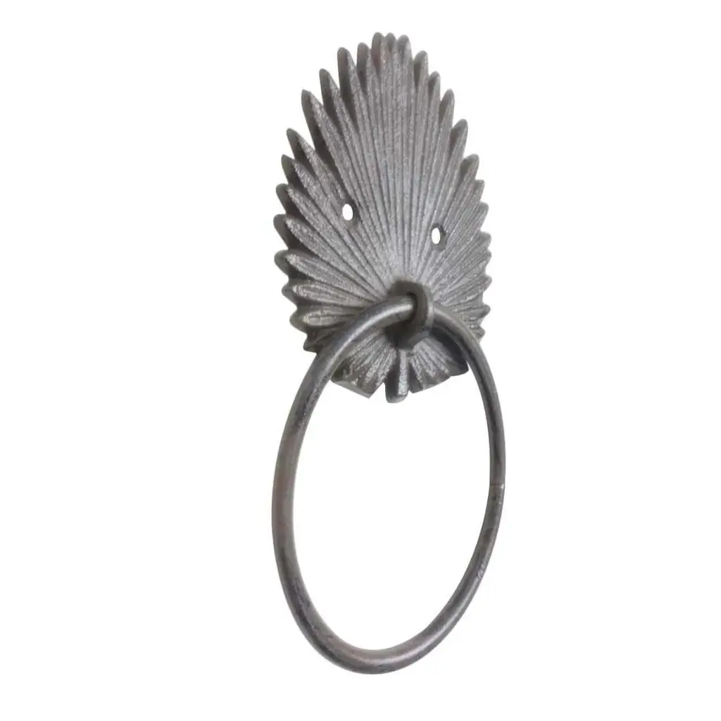 Specification:Description:Add a touch of coastal charm to your bathroom or kitchen with this Cast Iron Palm Frond Towel Holder. Measuring 4.5" L x 1" W x 8" H, this sturdy and heavy handcrafted piece features a stylish palm frond design, making it a perfect addition to a nautical or beach-themed space. The functional ring is ideal for hanging towels, offering both style and practicality. This durable towel holder is easy to mount, though screws are not included. Enhance your home with this unique decor piece that showcases your love for the tropical beach lifestyle.