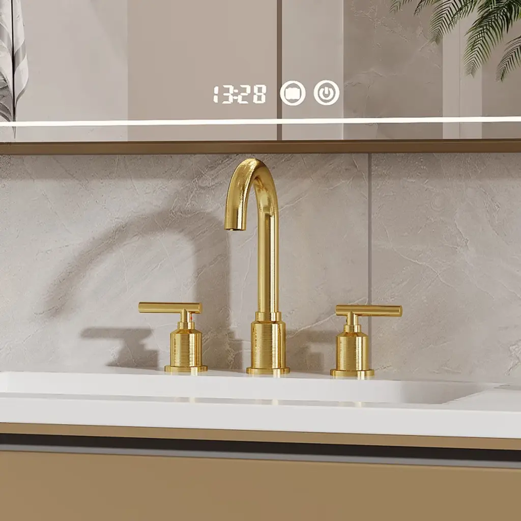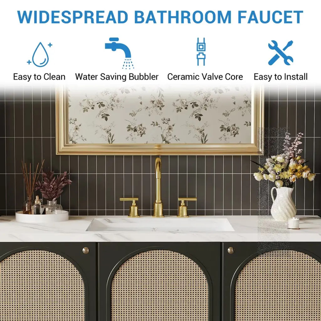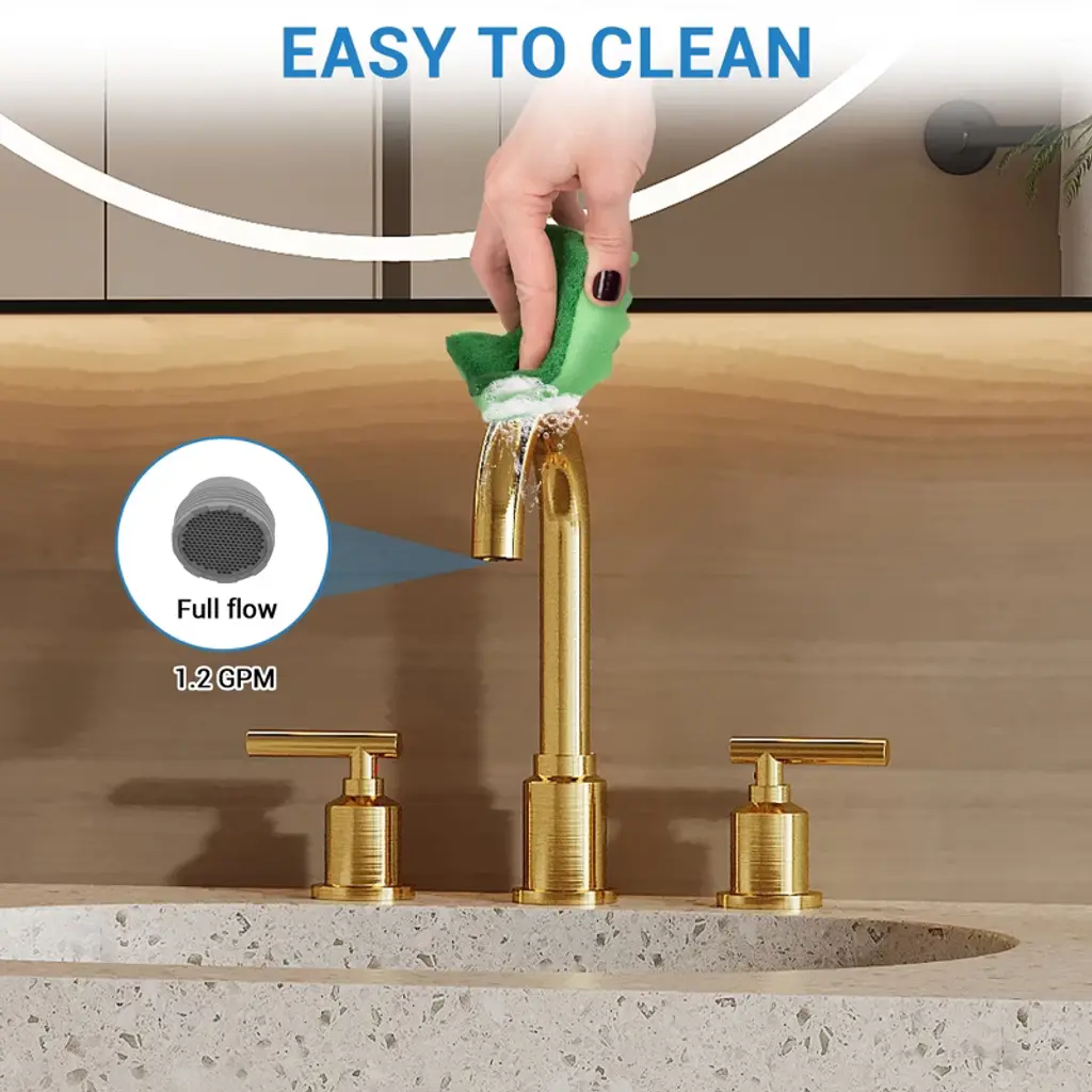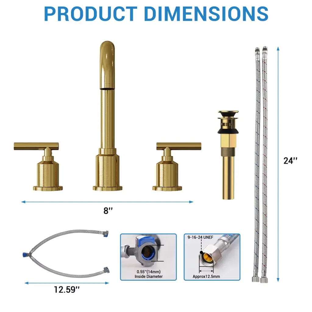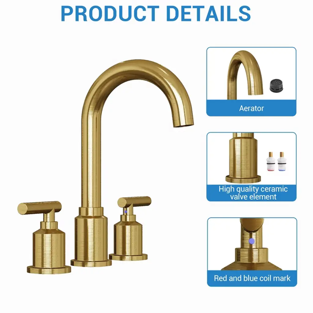 Product Description:This contemporary faucet complements various bathroom styles, from guest baths to suites. The included pop-up drain features sleek functionality 5, while the elegant chrome finish adds a touch of sophistication to any vanity space, making it perfect for residential and commercial applications FeatureBrushed Gold construction for corrosion resistance scratches and rust in daily useHigh quality ceramic valve core, advanced water control system, ceramic disc cartridge valve for leak-free performance,360 degree rotating spoutHigh-arc spout for enough sink space and clearance, Washing is more convenientComes with quick connector hose for easy installation, is easy to install by yourself without a plumberMeets CEC, cUPC and NSF certification requirements in pursuit of a safe environment, Safe and HarmlessProduct information:Product Dimensions: 14.96"D x 12.6"W x 3.94"HItem Weight: 3.8 poundsSpecial Features: Pop Up DrainFinish Type: Brushed