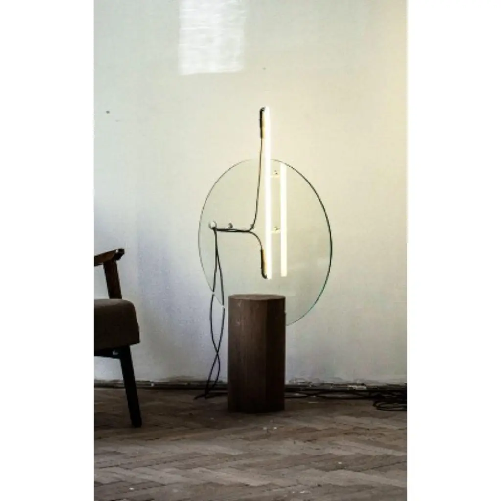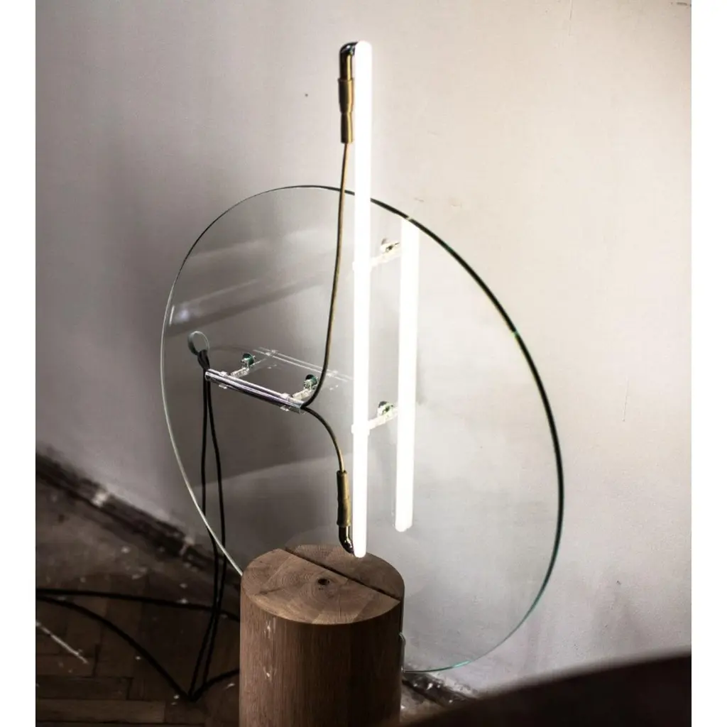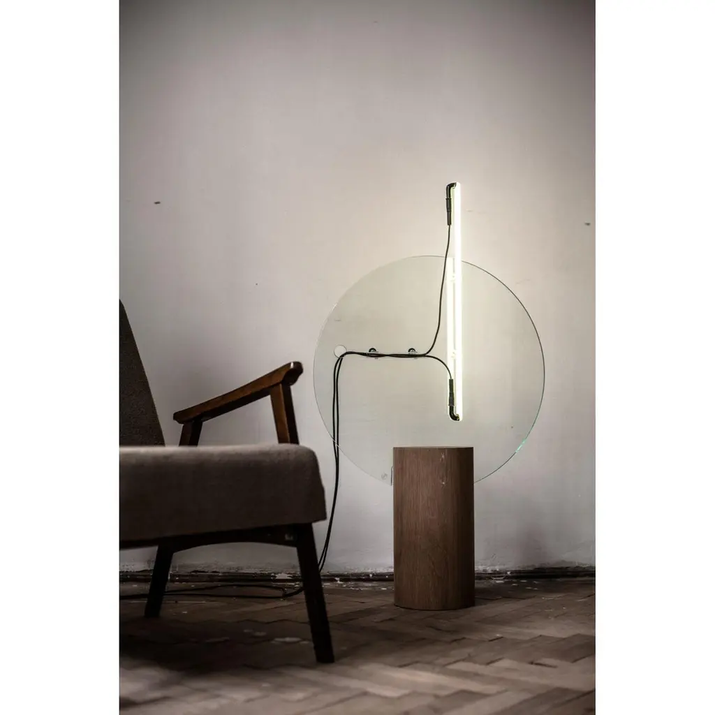 8 Minutes round by Radu AbrahamMaterials: oak wood, glass, custom made light tubeDimensions: 60 x 20 x 90 cmAll our lamps can be wired according to each country. If sold to the USA it will be wired for the USA for instance.The base is made out of a masive oak cylinder, that holds the glass on which the light tube stands. Each of the elements that compound the object is detachable.Inspired by geometrical shapes and ratios, with simple lines and clean composition, Radu Abraham is always looking for ways to experiment with the objects he is creating, through different contrasts, by color or by associating various materials with different properties. In Radu Abraham's design approach he is interested in exploring craft, this being part of his signature.