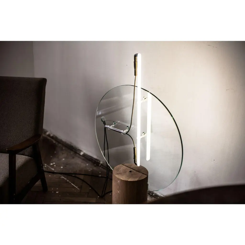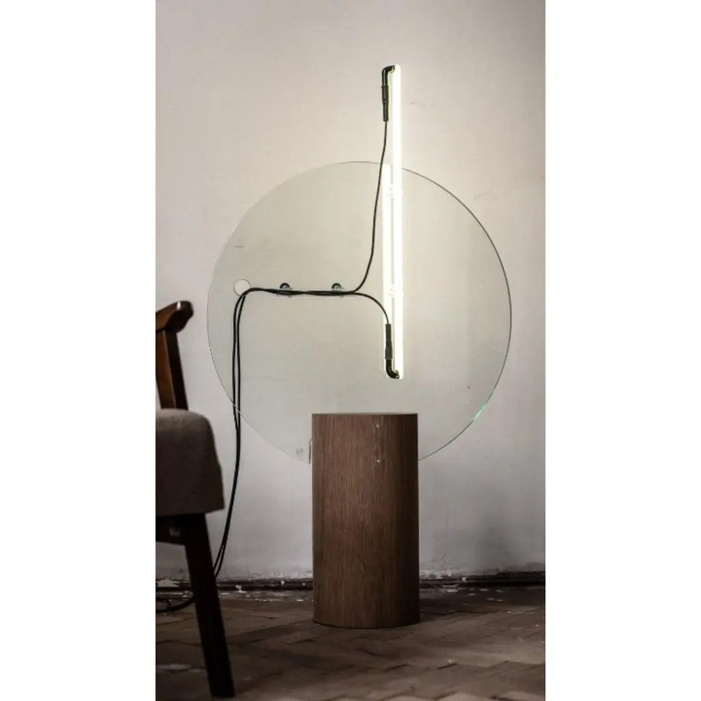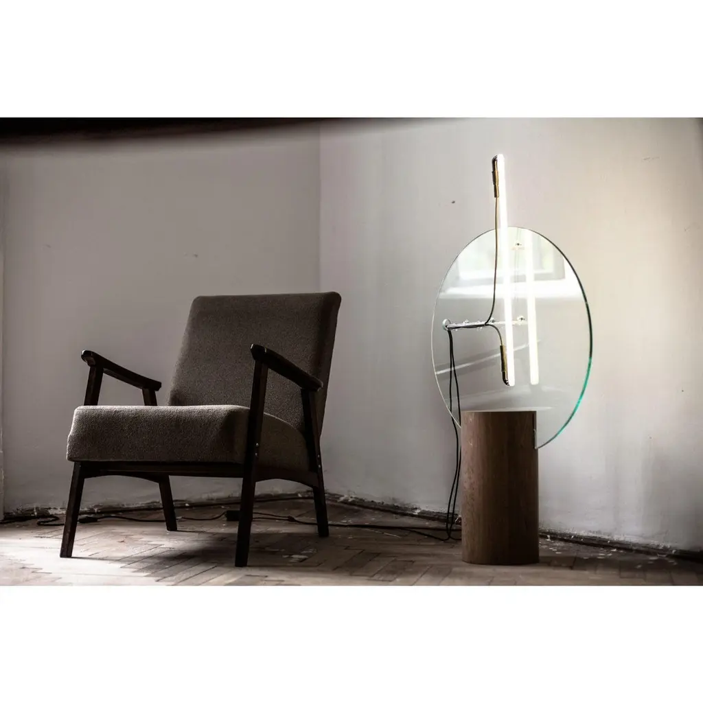 8 Minutes round by Radu AbrahamMaterials: oak wood, glass, custom made light tubeDimensions: 60 x 20 x 90 cmAll our lamps can be wired according to each country. If sold to the USA it will be wired for the USA for instance.The base is made out of a masive oak cylinder, that holds the glass on which the light tube stands. Each of the elements that compound the object is detachable.Inspired by geometrical shapes and ratios, with simple lines and clean composition, Radu Abraham is always looking for ways to experiment with the objects he is creating, through different contrasts, by color or by associating various materials with different properties. In Radu Abraham's design approach he is interested in exploring craft, this being part of his signature.